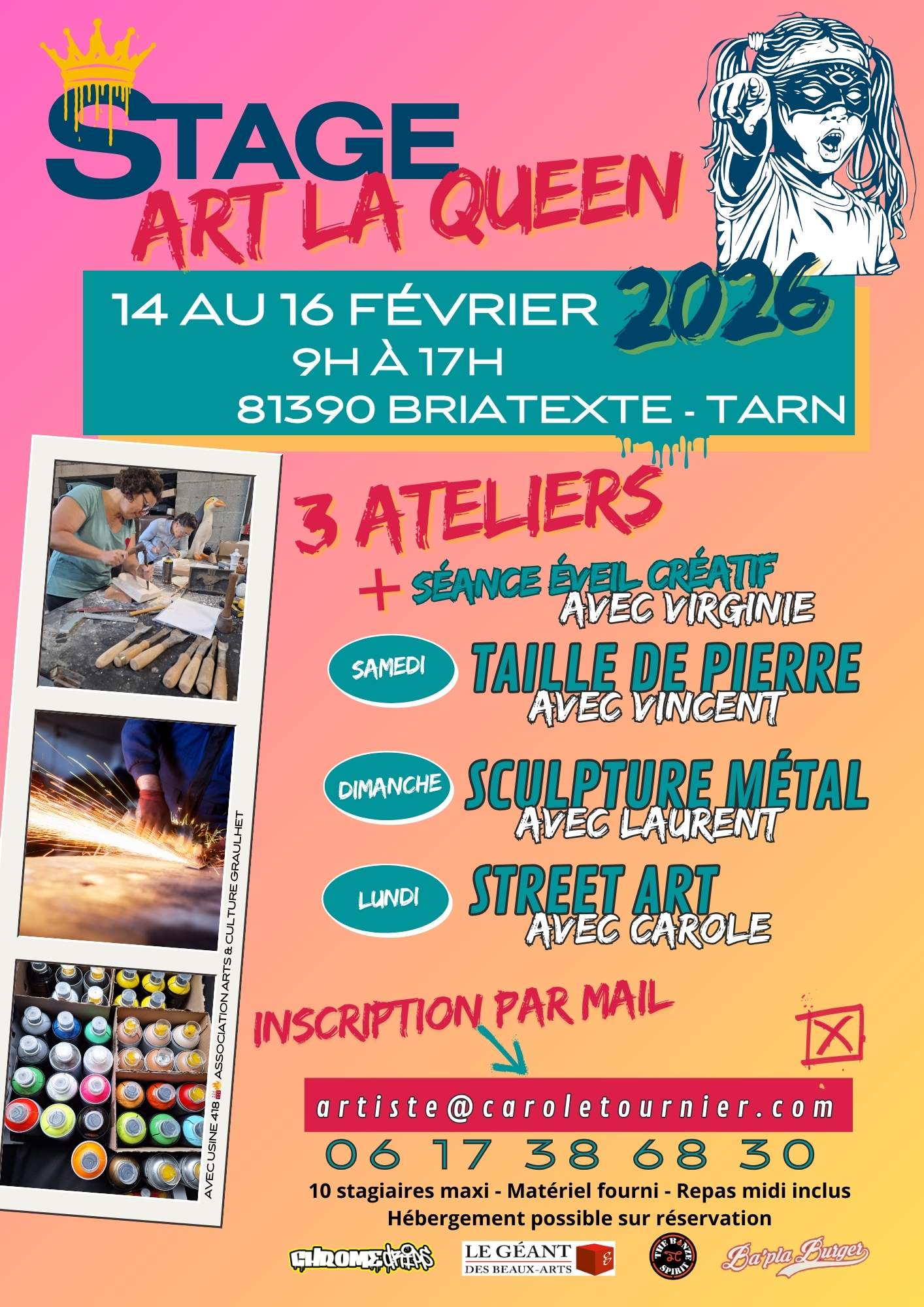 Lot n°3 : 2 places pour un stage d’Art de 3 jours, « ST.E.A.K. » (Stage Envol Art Kréatif) organisé par l’artiste Carole Tournier dans le Tarn, à choisir dans le planning 2025, d’une valeur de 900 € TTC