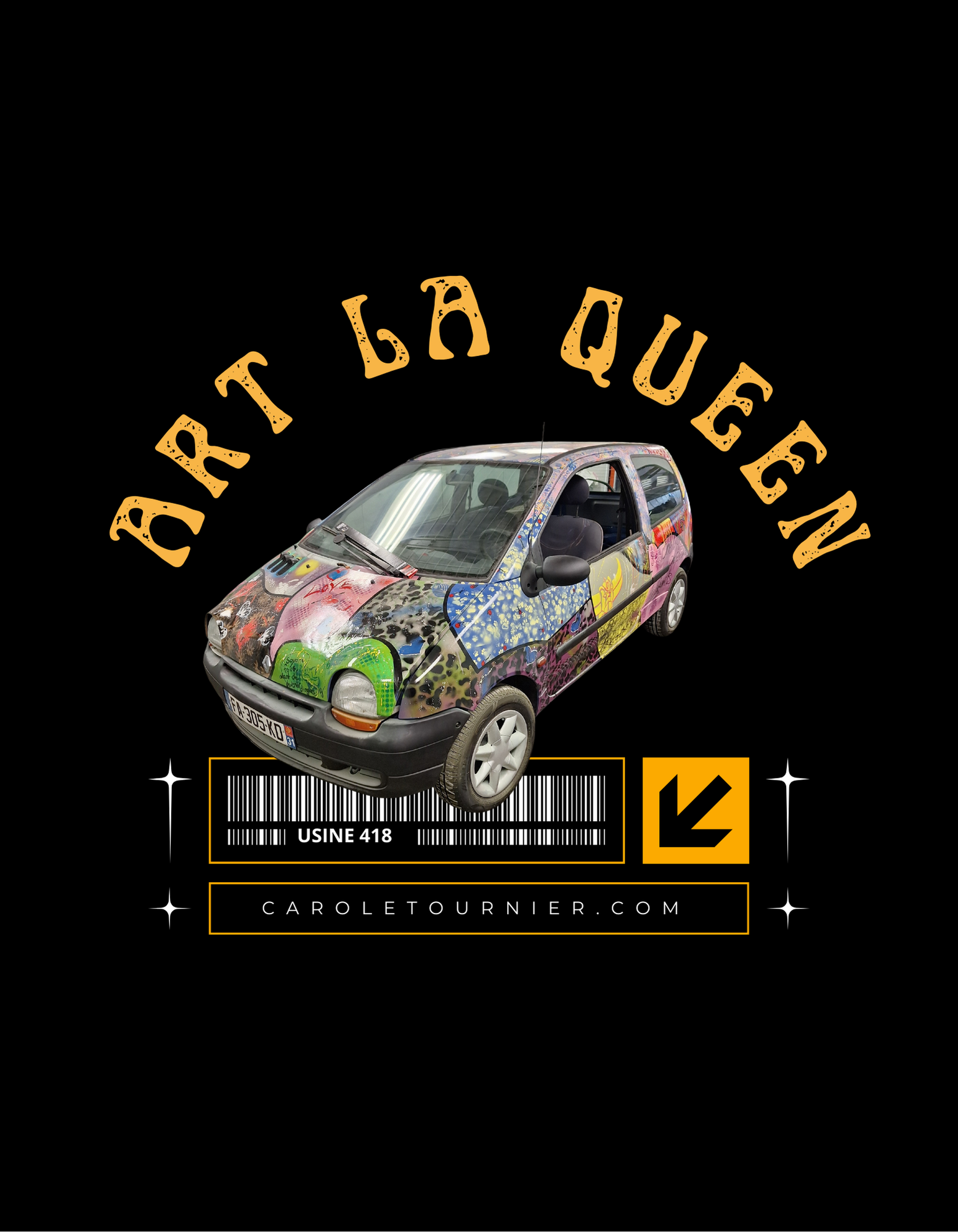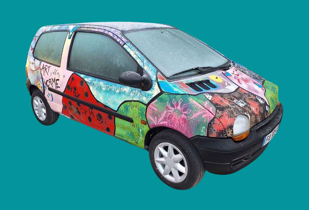 Lot n°1 : Une œuvre sur véhicule réalisée par 22 artistes lors d’un stage à l’atelier de Carole Tournier en novembre 2023. Le véhicule est de marque Renault, Twingo 1 phase 1 de 1994, d’occasion d’une valeur de 8000 € TTC (Oeuvre + Véhicule), désigné « ART la Queen » + carte grise offerte au nom du gagnant d’une valeur de 162,76 € TTC