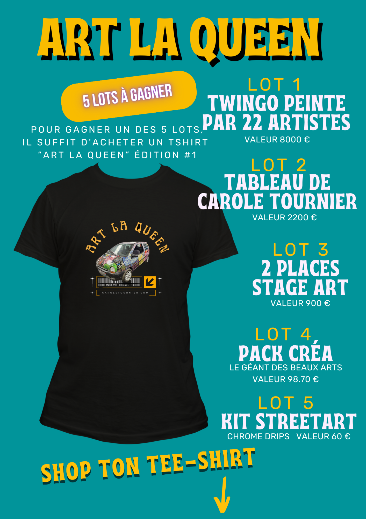 2. Acheter le T-Shirt ART la Queen édition#1 présent sur cette page au prix unitaire de 26€TTC (+frais de port le cas échéant) en choisissant la taille et la quantité désirée (1 T-Shirt = 1 participation au concours)