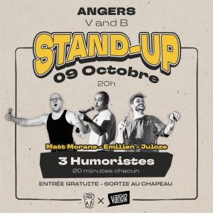 Le VandB d'Angers se transforme pour la première fois en comedy club le temps d'une soirée en compagnie de Juloze, Matt Morane, et Emilien. Venez découvrir (ou redécouvrir) l'ambiance d'un comedy club en compagnie de ces 3 humoristes