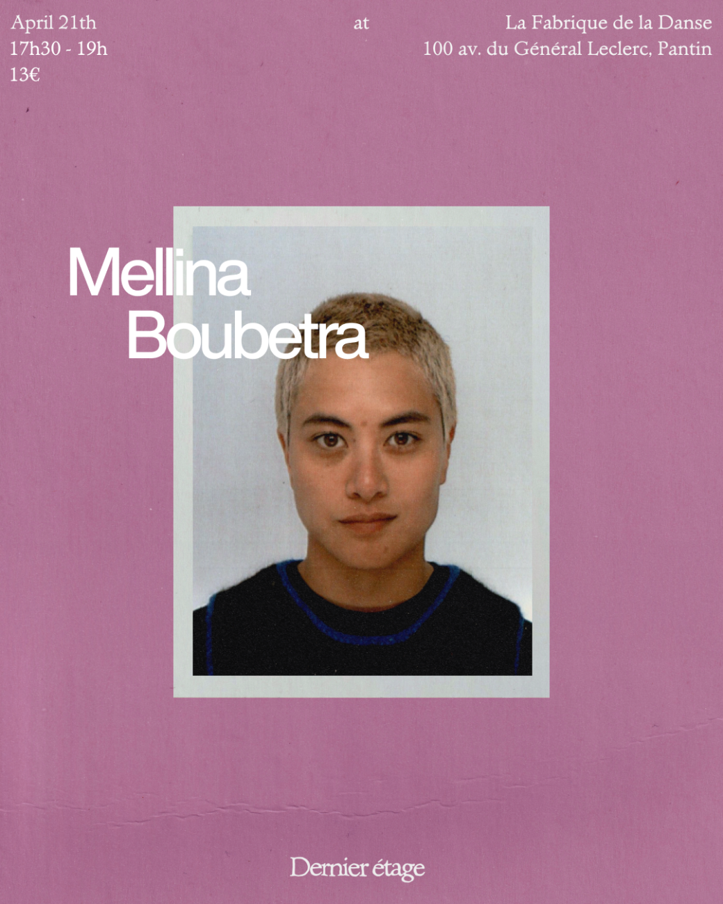 2026-04-21 17:30:002026-04-21 19:00:00Europe/Paris21/04/26 - by Dernier étage - Mellina BoubetaReservations on : https://www.billetweb.fr/18-04-26-by-dernier-etage-mellina-boubeta
