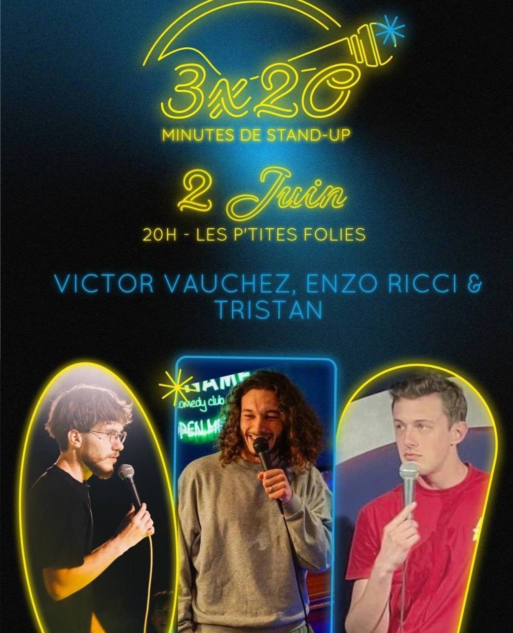 2023-06-02 20:00:00 2023-06-02 21:20:00 Europe/Paris 3 x 20 minutes - Enzo Ricci, Victor Vauchez & Tristan Reservations on : https://www.billetweb.fr/30-minutes-chacun-enzo-ricci-victor-vauchez -- Le Angers Comedy Club vous propose de voir nos jeunes angevins avec le vent en poupe sur 20 minutes de stand-up chacun ! Enzo Ricci, Victor Vauchez & Tristan pour votre plus grand plaisir !    Venez découvrir les humoristes du dimanche soir jouer sur 30 minutes dans l'optique de création de leur prochain spectacle.   Début du spectacle 20h  Les P'tites Folies, 24 Avenue Pasteur, Angers, France Les Folies Angevines