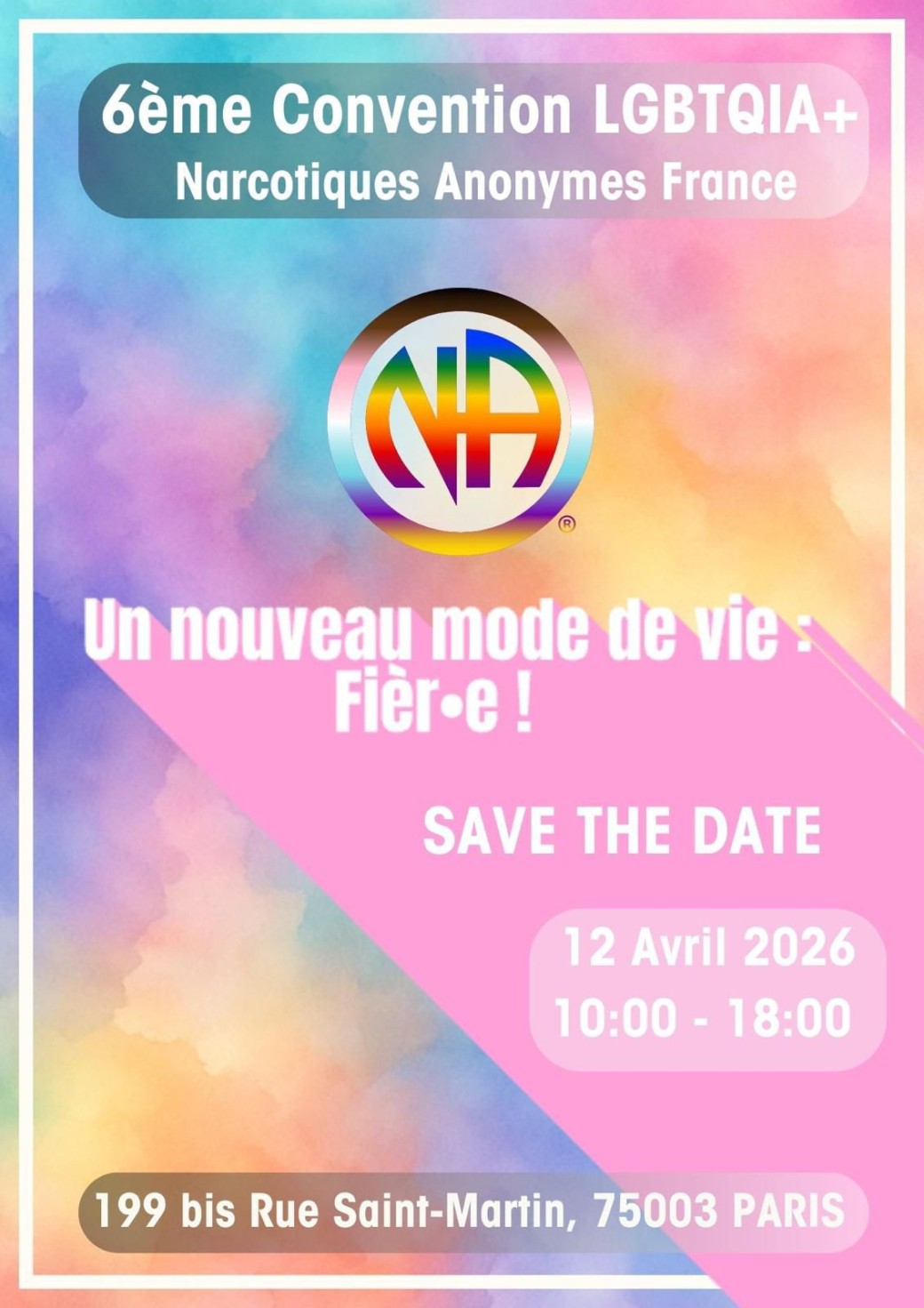 Nous avons la joie de vous inviter à la 6ème Convention LGBTQIA+ de Narcotiques Anonymes France, un week-end placé sous le signe du rétablissement, de la fierté et de l’unité.