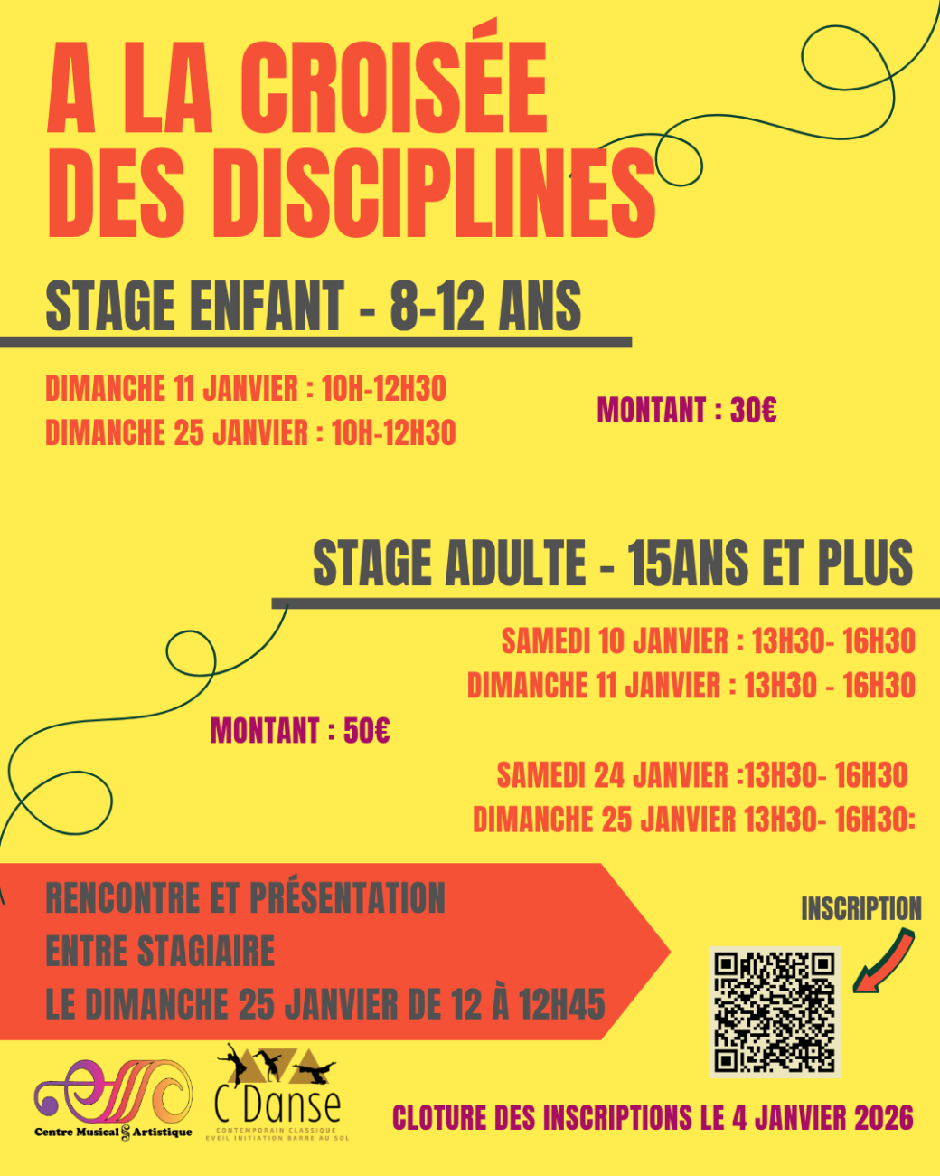 2026-01-10 10:00:002026-01-25 16:30:00Europe/ParisA la croisée des disciplines - théâtre.Musique.DanseReservations on : https://www.billetweb.fr/a-la-croisee-des-disciplines-theatre-musique-danse