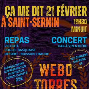 La soirée se déroulera en intérieur chauffé et est accessible uniquement sur réservation. L'accès au concert (sans repas) est possible à partir de 21h (5€ - sur réservation).