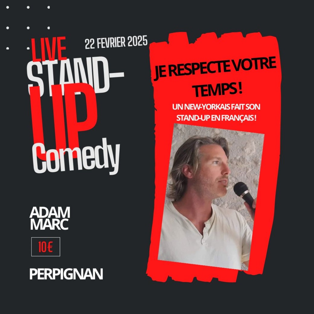 2025-02-22 21:00:00 2025-02-22 22:30:00 Europe/Paris Adam Marc : "Je respecte votre temps ! " Reservations on : https://www.billetweb.fr/adam-marc-je-respecte-votre-temps-perpignan -- " Adam Marc est un New-Yorkais cru qui a été saisi à Miami avant d'être glacé avec du Côtes du Roussillon. Mijotant avec ses boules de picoulat, il a décidé que les espressos étaient trop petits et que son destin était de "Make Coffee Big Again " ! En tant que survivant de Covid, il partage ses expériences et idées et surtout, il respecte votre temps dans sa toute nouvelle comédie spéciale. “   " l'originalité du spectacle se mêle parfaitement avec l'originalité du lieu. On rigole dans une ambiance familiale de sujets qu'on n'aborde jamais en famille ! " Brian 25 ans, cuisinier   " la vérité troublante, qui accompagne les vannes les plus absurdes, nous a provoqué des débats par la suite qui nous ont fait autant marrer et confesser ! " Samantha, 35 ans, bonne sœur   " c'était nul à chier ! Je n'ai rien compris avec son accent de merde, mais j'ai terminé la soirée dans son lit, il ferme pas ses portes à clé ! " Christelle, 58 ans, femme au foyer    Le lieu exact vous sera communiqué pro… Perpignan, France Adam Marc
