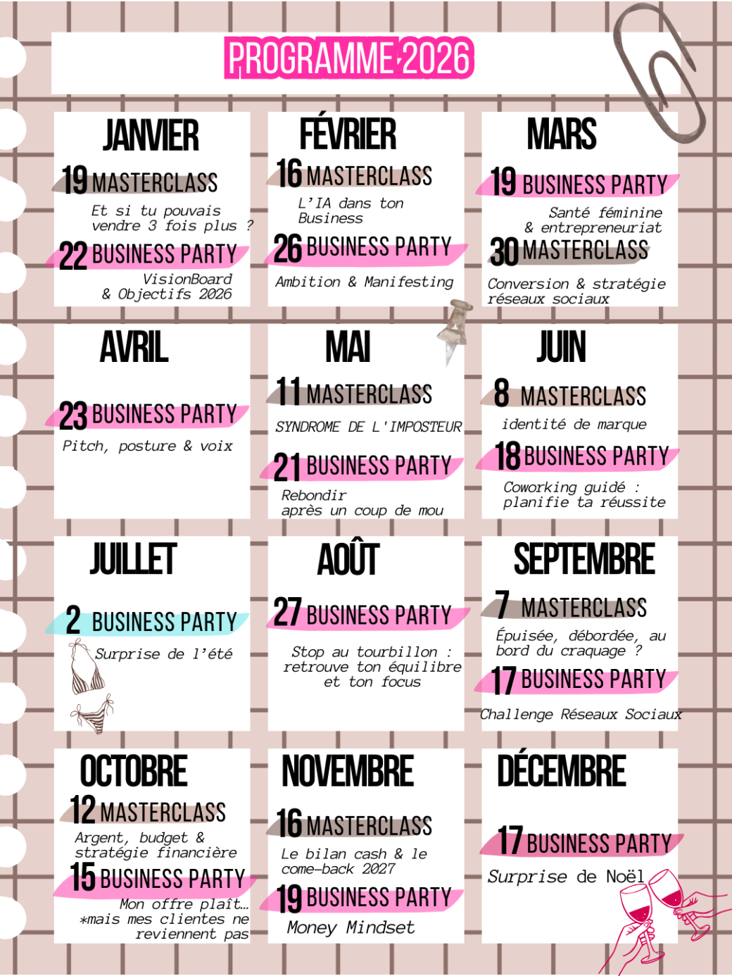 Vision • Ambition • Santé féminine • Pitch • Conversion • Imposteur • Identité • Organisation • Fidélisation • Argent • Money Mindset • Bilan & Come-back.