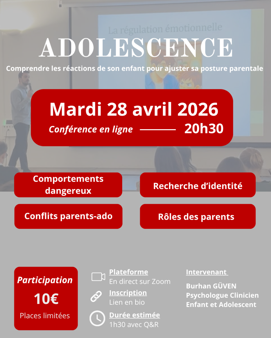2026-04-28 20:30:002026-04-28 22:00:00Europe/ParisAdolescence : Comprendre les réactions de son enfant pour ajuster sa posture parentaleReservations on : https://www.billetweb.fr/adolescence-comprendre-les-reactions-de-son-enfant-pour-ajuster-sa-posture-parentale