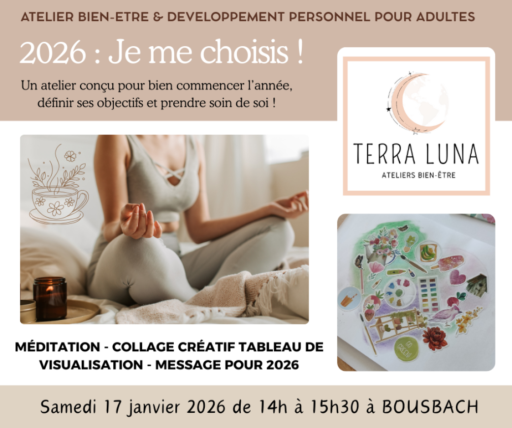 2026-01-17 14:00:00 2026-01-17 15:30:00 Europe/Paris ADULTES - 2026 : Je me choisis ! Reservations on : https://www.billetweb.fr/adultes-2026-je-me-choisis -- Atelier Adulte : 2026 – Je me choisis   Reconnectez-vous à vous-même et à vos envies pour la nouvelle année     Au programme : Méditation guidée pour poser vos intentions et vous recentrer Création d’un tableau de visualisation pour manifester vos projets et rêves Exercices de réflexion et d’écriture pour clarifier vos priorités Message conseil pour 2026   Objectif : Vous offrir un temps pour vous choisir, vous écouter, et poser les bases d’une année 2026 alignée avec vos désirs et besoins.   Lieu : Studio bien-être de BOUSBACH (2 Rue Charlemagne 57460 BOUSBACH) Accessible aux ados (16 ans et +) et adultes     2 Rue Charlemagne, Bousbach, France Elsa Kieffer EI
