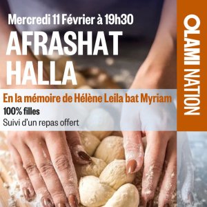 2026-02-11 19:30:00 2026-02-11 22:00:00 Europe/Paris Afrashat halla Reservations on : https://www.billetweb.fr/afrashat-halla-meme-helene -- La Afrashat halla est une mitsva qui apporte d'immenses bénédictions. Elle fait partie des trois mitsvotes phares de la femme juive.   Nous avons décidé d’organiser cette belle soirée en la mémoire de Mémé Hélène, la grand-mère d’Eden, tout en souhaitant qu’elle soit source de bénédictions pour chacun et chacune d’entre nous ! Le cours sera donné par la merveilleuse Ayala Hayat   Les mains à la pâte, à la matérialité, on essaiera de connecter le matériel au spirituel, et de construire un pont entre le Ciel et la Terre. On vous attend nombreuses ! On se donne rendez-vous le mercredi 11 février à 19h30 au centre Olami Nation Entrée sur inscription : olami-cadet-nation.fr Olami nation, Cité Moynet, Paris, France Olami Nation