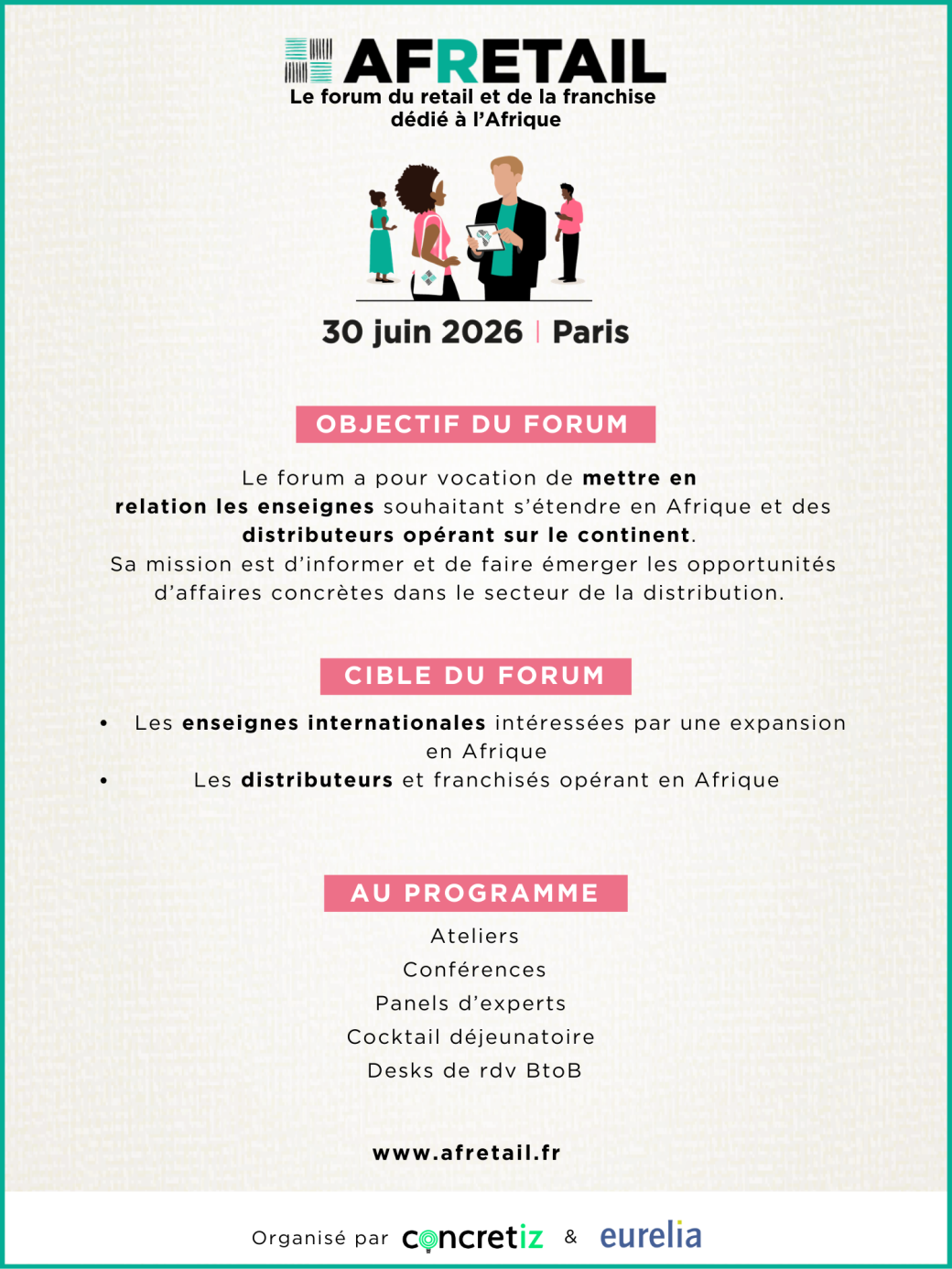 2026-06-30 08:30:00 2026-06-30 08:30:00 Europe/Paris AFRETAIL 2026 Reservations on : https://www.billetweb.fr/afretail-2026 -- AFRETAIL est le premier forum dédié au retail et à la franchise en Afrique.   Le forum revient pour sa troisième édition le 30 juin 2026 à Paris.    Venez rencontrer des enseignes internationales s'intéressant au continent africain afin d'explorer des opportunités de partenariat concrètes.    La matinée sera consacrée à la découverte du continent africain à travers des conférences et des tables rondes, suivi d'un cocktail déjeunatoire de networking, et l'après-midi sera consacrée aux stands d'expositions et aux rendez-vous BtoB.  ___   AFRETAIL is the first forum for retail & franchise dedicated to Africa.   The forum returns for its second edition on 30 June 2025 in Paris.  Come and meet international brands interested by the African continent to explore concrete partnership opportunities.    The morning will be devoted to discovering the African continent through conferences and round tables, followed by a networking cocktail reception, and the afternoon will be devoted to exhibitio… Paris, France Concretiz & Eurelia (Procos)