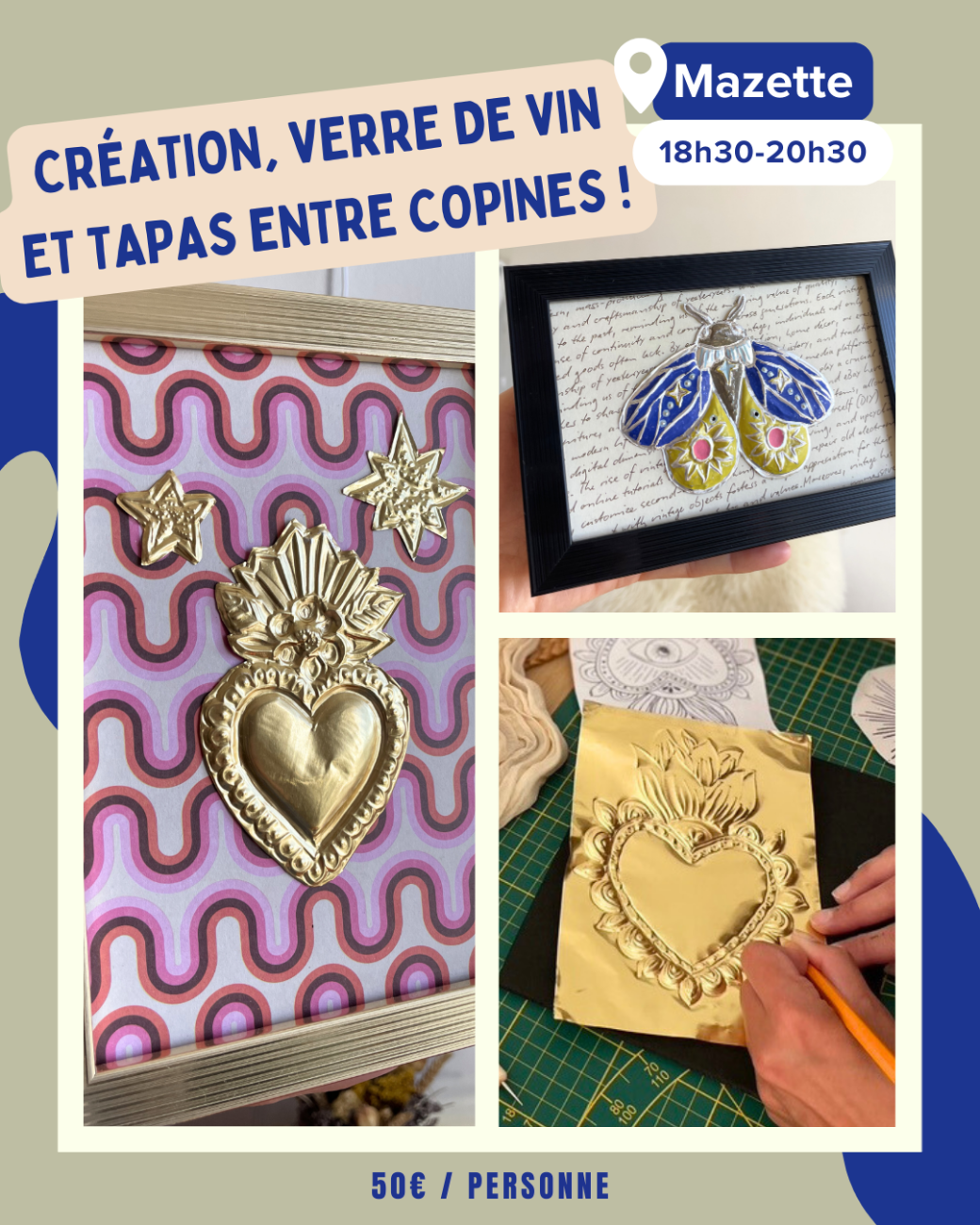 Tarif : 50€ / personne (incluant un verre de vin ou soft, une planche de tapas à partager et l’atelier créatif)