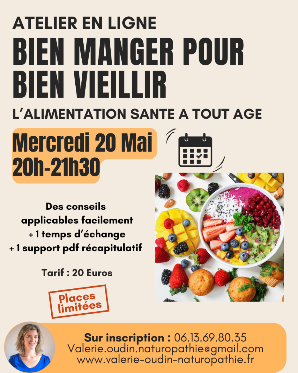 2026-05-20 20:00:00 2026-05-20 21:30:00 Europe/Paris Alimentation santé : Bien manger pour bien vieillir Reservations on : https://www.billetweb.fr/alimentation-sante-bien-manger-pour-bien-vieillir -- Vous souhaitez prendre soin de votre santé en adoptant une alimentation plus saine, mais vous ne savez pas trop par où commencer ? Quel que soit votre âge et votre parcours de santé, cet atelier est fait pour vous !   Après quelques informations théoriques sur les notions d’équilibre acido-basique et d’inflammation, nous parlerons des différents groupes d’aliments, des macro nutriments et des micro nutriments.   Acides aminés, acides gras essentiels, vitamines et minéraux alliés d’une santé durable et d’une plus grande vitalité n’auront plus de secret pour vous. Vous repartirez avec des conseils concrets, applicables immédiatement et sur le long terme pour faire vos courses et votre cuisine plus sainement. - Valérie Oudin EI
