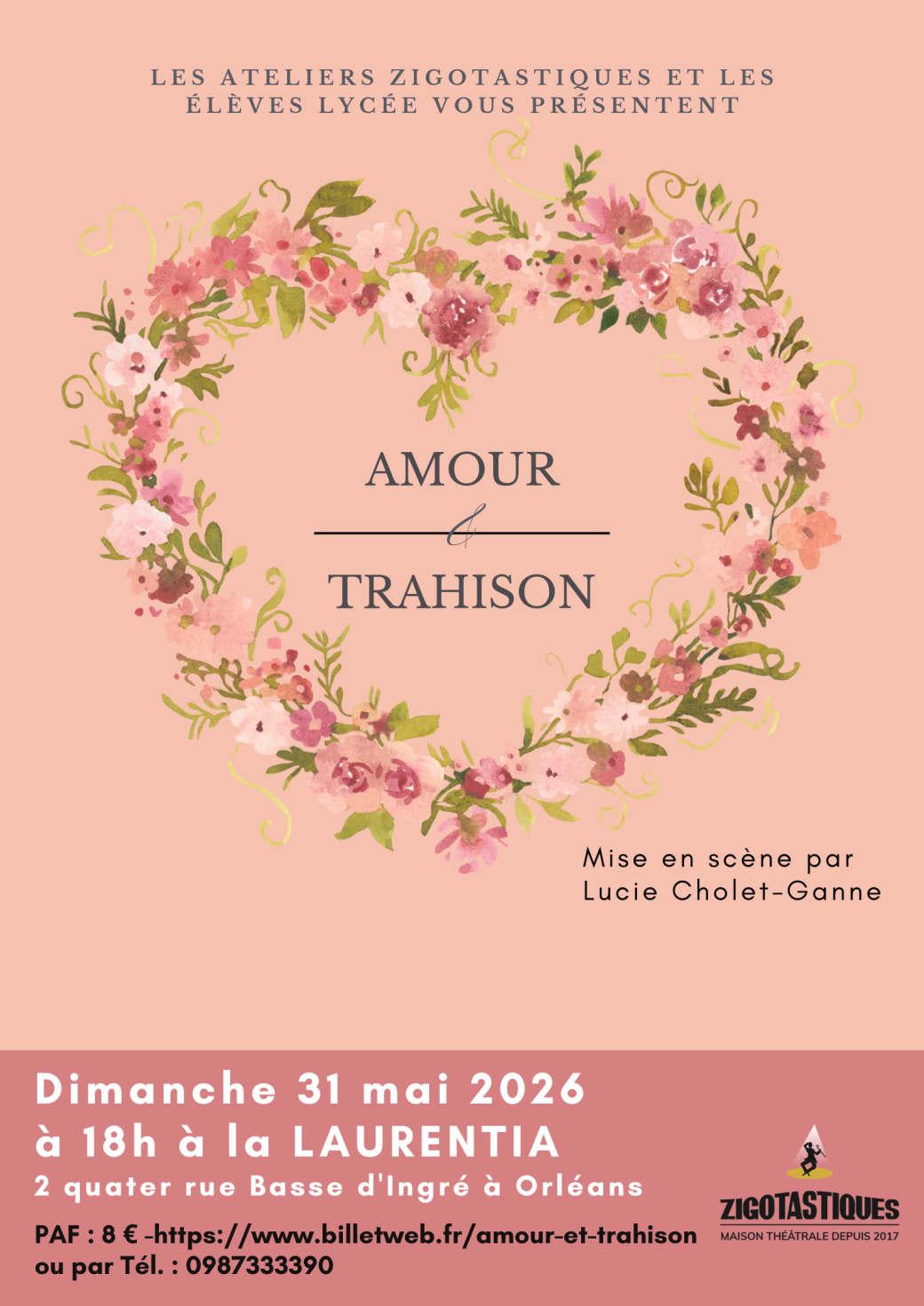 2026-05-31 18:00:00 2026-05-31 19:15:00 Europe/Paris Amour et trahison Reservations on : https://www.billetweb.fr/amour-et-trahison -- Les Vedettes 1 menés par Lucie Cholle-Ganne chez Zigotastiques vous proposent "Amour et trahison".   Une envie d'indépendance, un amour naissant et des quiproquos... Le cocktail idéal pour une romance semée d'embûches sur les premiers amours et l'entrée dans l'âge adulte.   Dimanche 31 mai à 18h Ouverture des portes à 17h30 Lieu : La Laurentia, 2 quater rue basse d'ingré - Orléans Buvette sur place - Programme bientôt disponible.   La Laurentia, Orléans, France ZIGOTASTIQUES