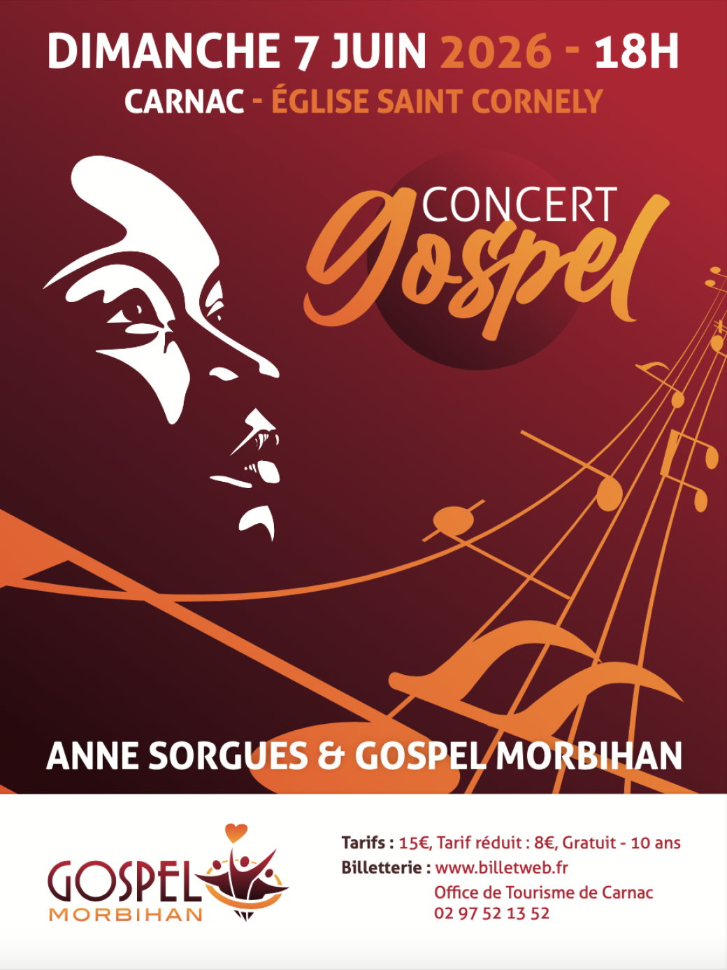 Anne Sorgues et la chorale Gospel Morbihan reviennent à l'église Saint-Cornély pour un concert gospel sous le signe du partage et de la joie. Ils seront accompagnés pour l'occasion de Hugues Defrance au clavier, Etienne Callac à la basse et Jean-Marie Stéphant à la batterie, avec un répertoire mélant gospel traditionnel et moderne.