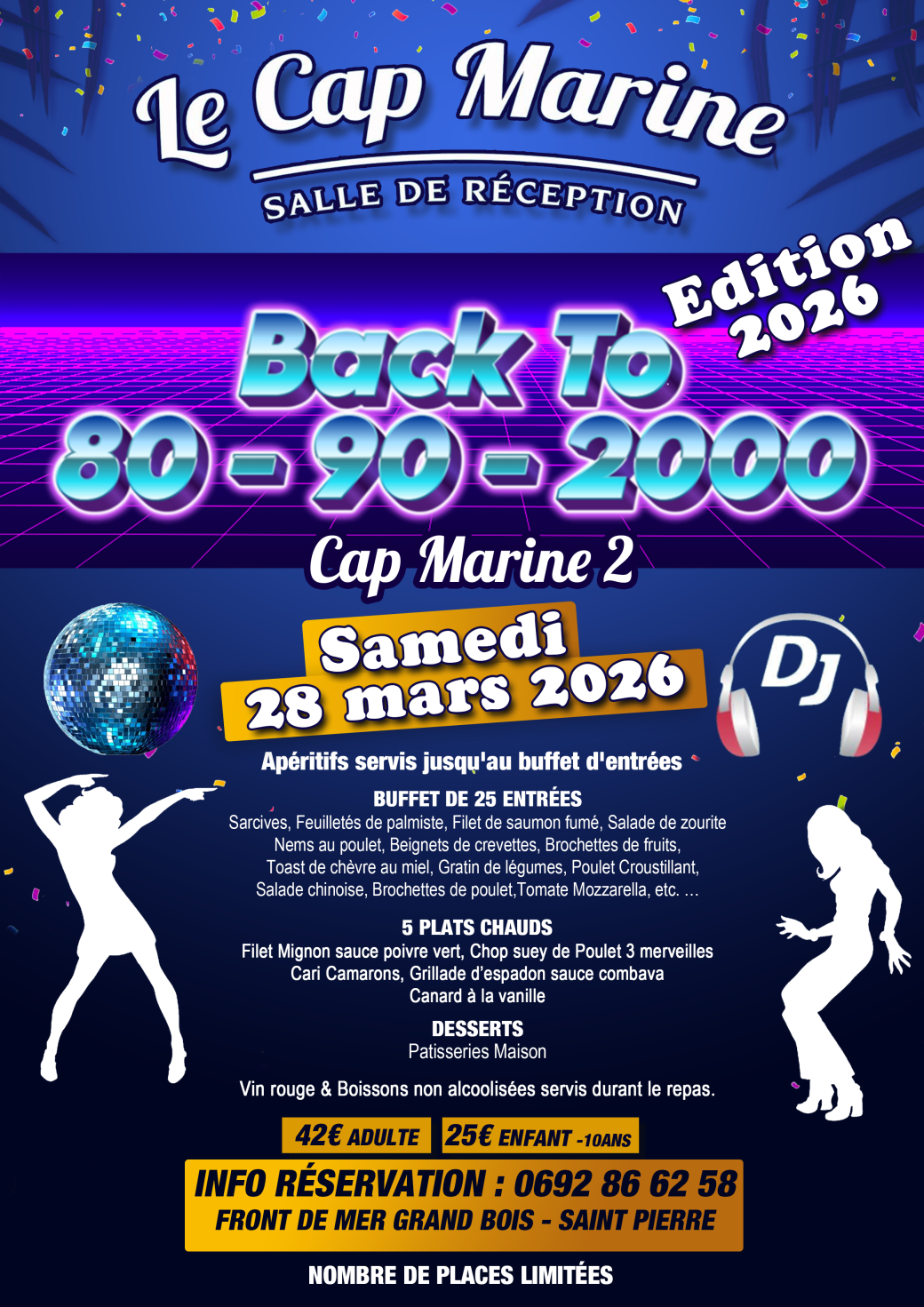 Venez célébrer vos plus belles années musicales dans une ambiance élégante et festive au Cap Marine 2 à Saint-Pierre, face à la mer.