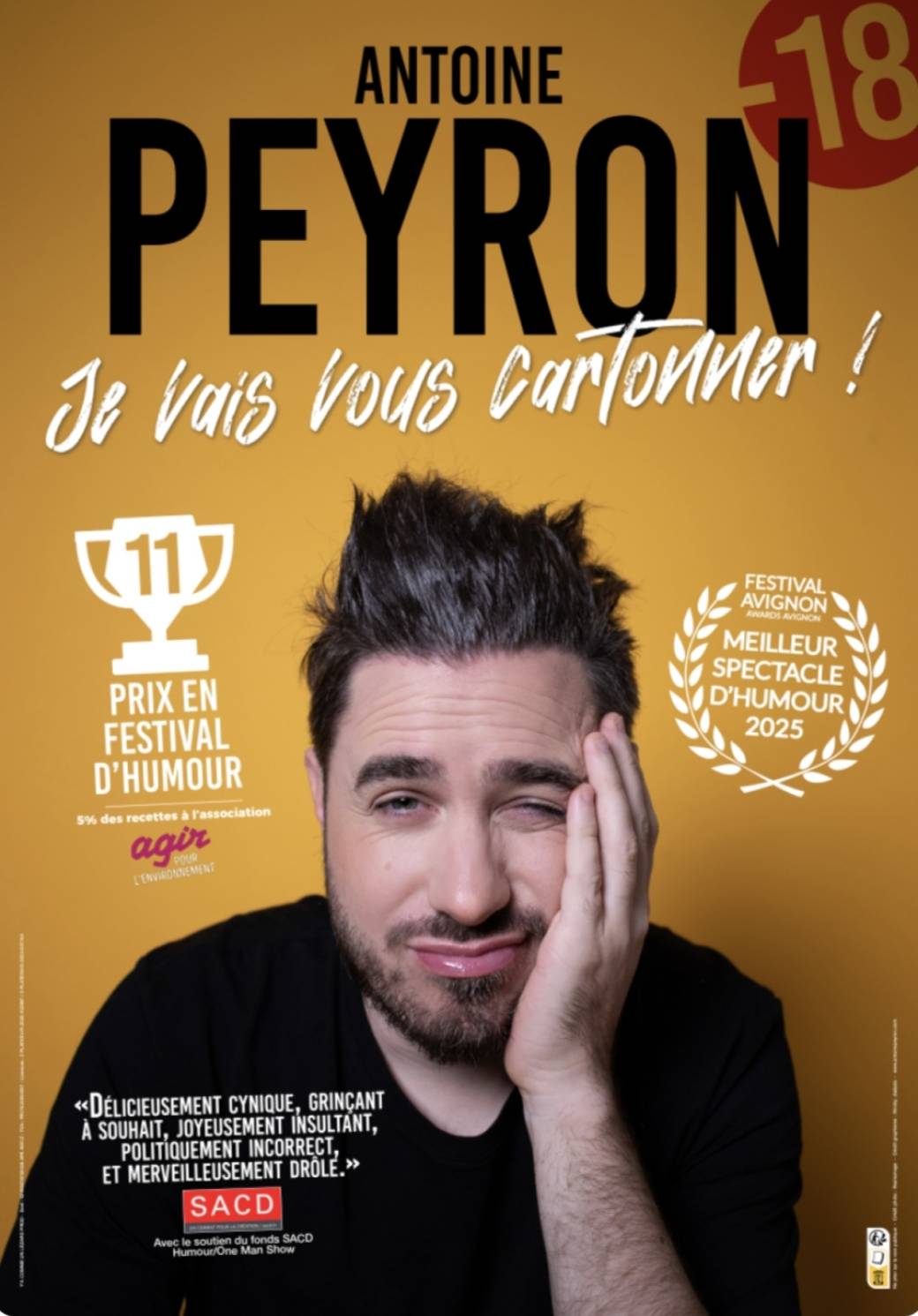 Success story : Antoine enchaîne les salles combles partout en France depuis 2024. Plus de 11 prix remportés en festivals d’humour dont celui du meilleur spectacle du Festival d’Avignon 2025 (catégorie humour), plus de 600 critiques 5 étoiles sur BilletReduc (10/10), et un spectacle soutenu par la SACD dans le cadre du fonds Humour/One Man Show.