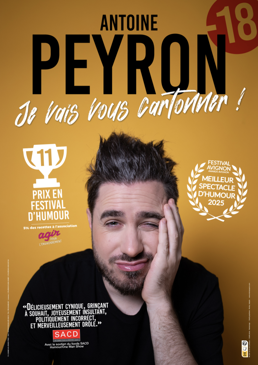 Success story : Antoine enchaîne les salles combles partout en France depuis 2024. Plus de 11 prix remportés en festivals d’humour dont celui du meilleur spectacle du Festival d’Avignon 2025 (catégorie humour), plus de 600 critiques 5 étoiles sur BilletReduc (10/10), et un spectacle soutenu par la SACD dans le cadre du fonds Humour/One Man Show.