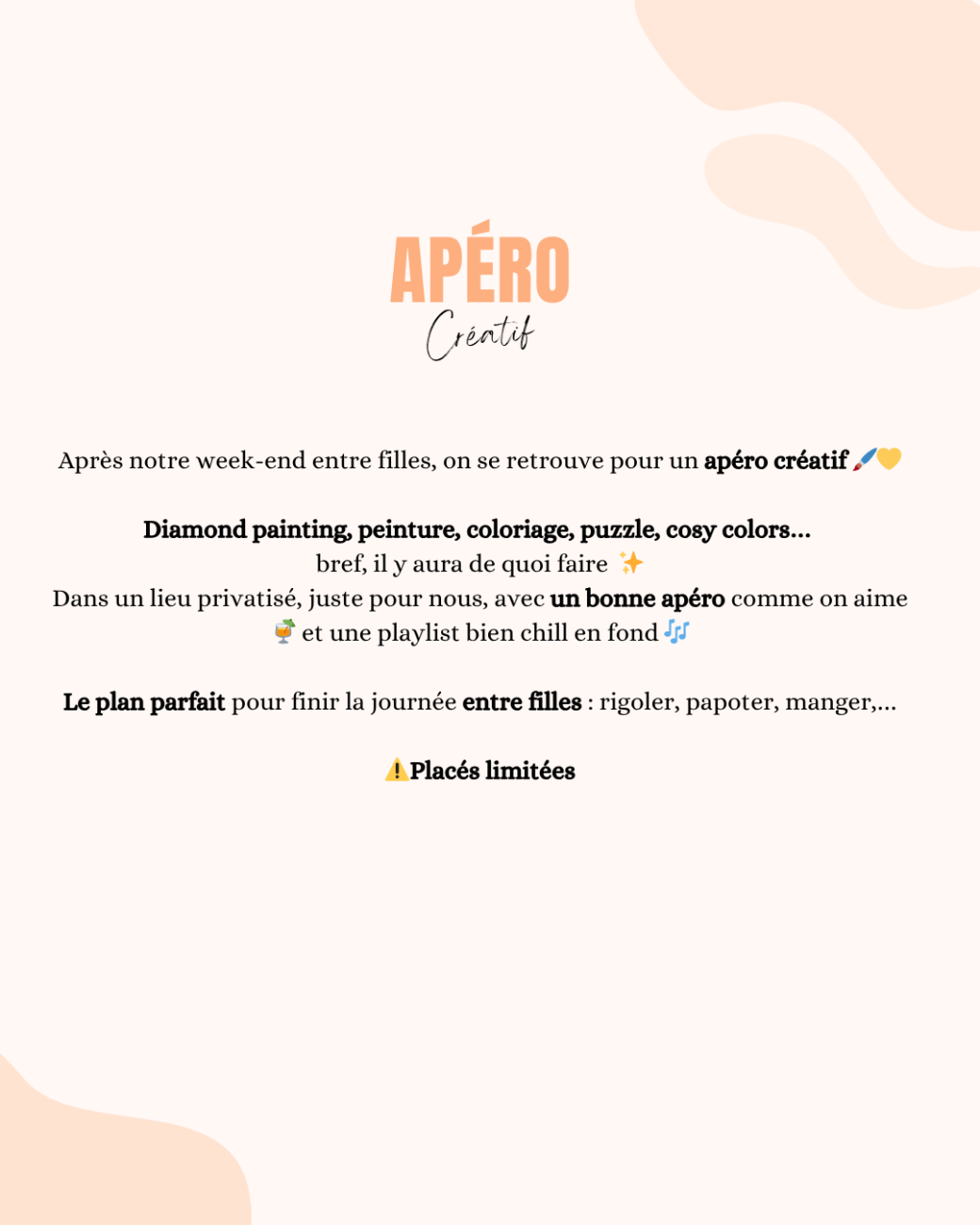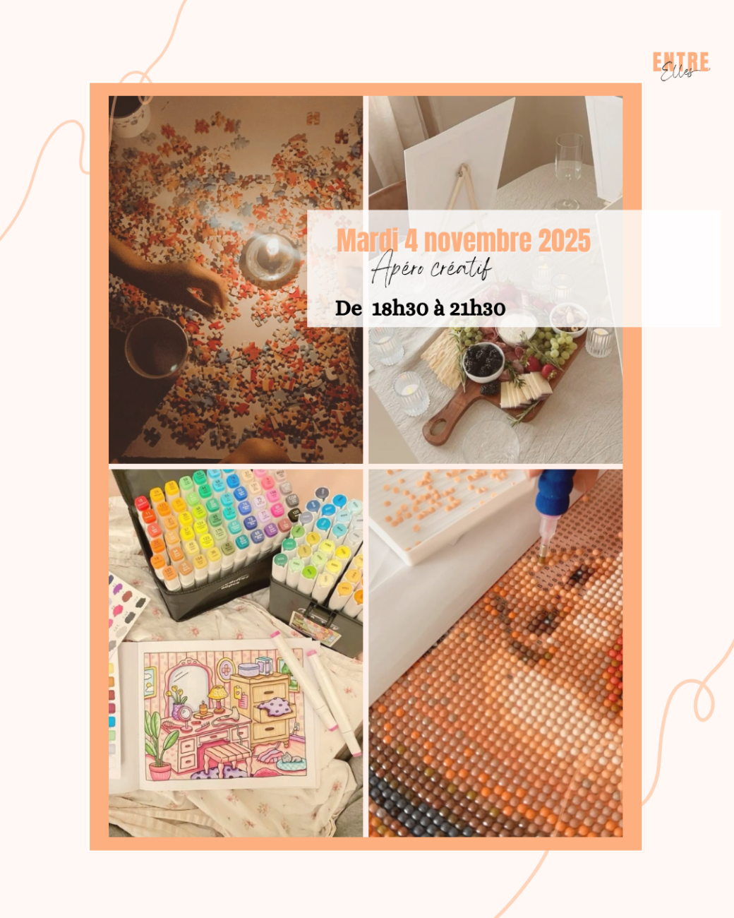 2025-11-04 18:30:00 2025-11-04 21:30:00 Europe/Paris Apéro Créatif Reservations on : https://www.billetweb.fr/apero-creatif6 --                                        ------------------------------   ⚠️ ATTENTION :   En cas d’annulation, le billet ne pourra être remboursé. Cependant, si tu souhaites l'offrir ou le revendre à une copine / sœur / collègue, ceci est possible. Quoi que tu décides, pense à me tenir informé de ta décision. Merci pour ta compréhension & hâte de te retrouver ! ✨ 7VB Café Mulhouse, Place de la République, Mulhouse, France Entre Elles