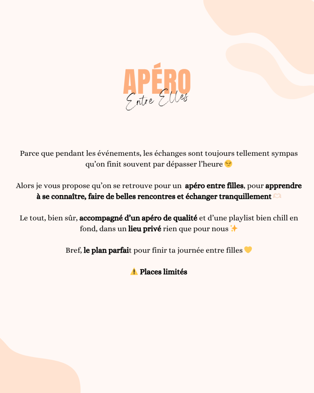 2025-11-13 18:30:00 2025-11-13 21:30:00 Europe/Paris Apéro Reservations on : https://www.billetweb.fr/apero7 --                                        ------------------------------   ⚠️ ATTENTION :   En cas d’annulation, le billet ne pourra être remboursé. Cependant, si tu souhaites l'offrir ou le revendre à une copine / sœur / collègue, ceci est possible. Quoi que tu décides, pense à me tenir informé de ta décision. Merci pour ta compréhension & hâte de te retrouver ! ✨ 7VB Café Mulhouse, Place de la République, Mulhouse, France Entre Elles