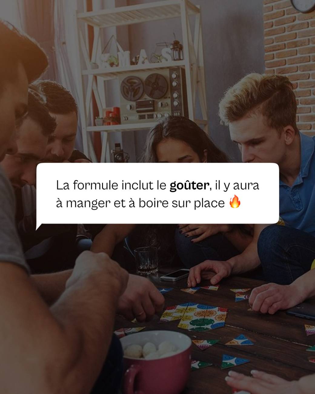 Le prix inclut l'animation et le goûter ! Il y aura des boissons et de quoi grignoter, et surtout plein de jeux à découvrir.