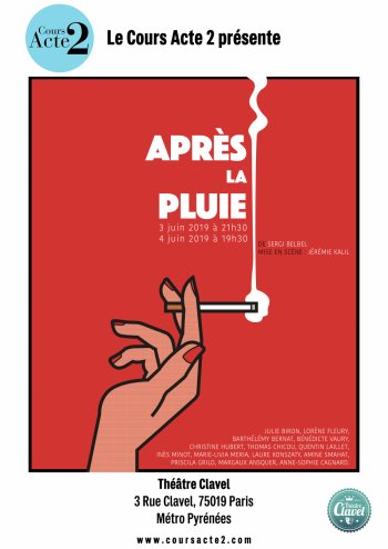 2019-06-03 21:30:00 2019-06-04 21:00:00 Europe/Paris Après la pluie Reservations on : https://www.billetweb.fr/apres-la-pluie1 -- Texte de Sergi Belbel. Mise en scène de Jérémie Kalil.Résumé : Tous les employés de cette entreprise se retrouvent sur la terrasse de leur immeuble pour braver l'interdit. Ils n'ont pas le droit de fumer. Depuis deux ans, il ne pleut pas et ils sont complètement détraqués !Avec : Margaux Ansquer, Barthélemy Bernat, Julie Biron, Anne-Sophie Cagnard, Thomas Chicou, Lorène Fleury, Priscila Grilo, Christine Hubert, Laure Konczaty, Quentin Laillet, Marie-Livia Meria, Inès Minot, Amine Smahat, Bénédicte Vaury. Théâtre Clavel, Rue Clavel, Paris, France Cours Acte 2