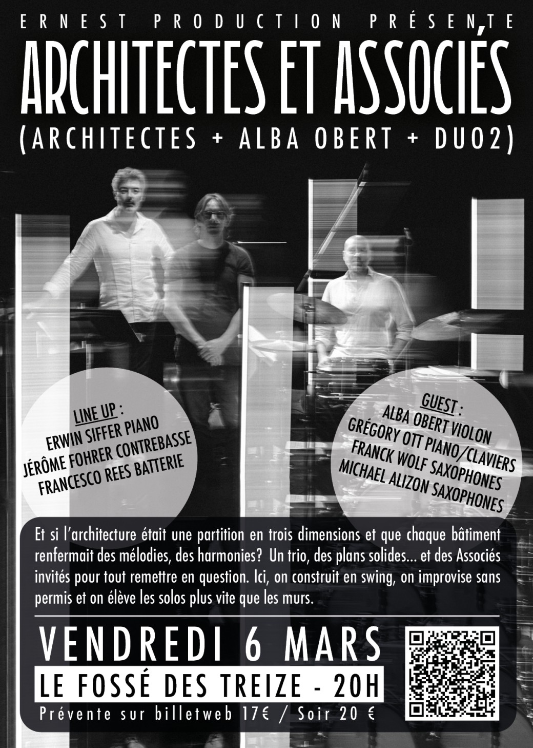 2026-03-06 19:00:002026-03-06 23:30:00Europe/ParisArchitectes et Associés (Architectes + Alba Obert + Duo2) au Fossé des TreizeReservations on : https://www.billetweb.fr/architectes-et-associes-architectes-alba-obert-duo2-au-fosse-des-treize