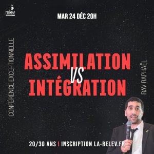 2024-12-24 20:00:00 2024-12-24 21:00:00 Europe/Paris Assimilation vs Intégration - Rav Raphael Reservations on : https://www.billetweb.fr/assimilation-vs-integration-rav-raphael -- Est ce que l'intégration s'apparente à de l'assimilation ? Sommes-nous assimilés lorsque nous nous intégrons ? Conférence de Rav Raphaël - mardi 24 décembre à 20h Pour les 20-30 ans suivi d'un repasµ la-relev.fr - Relev