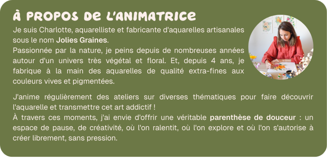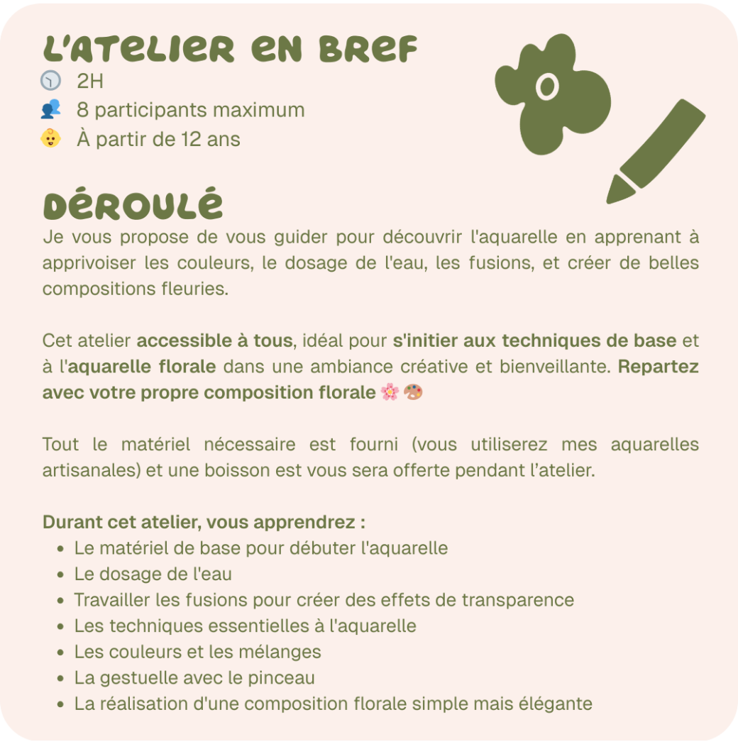 Offrez-vous une parenthèse créative pour découvrir la magie de l’aquarelle. Un moment chaleureux et apaisant pour explorer votre créativité et repartir avec une belle composition florale !