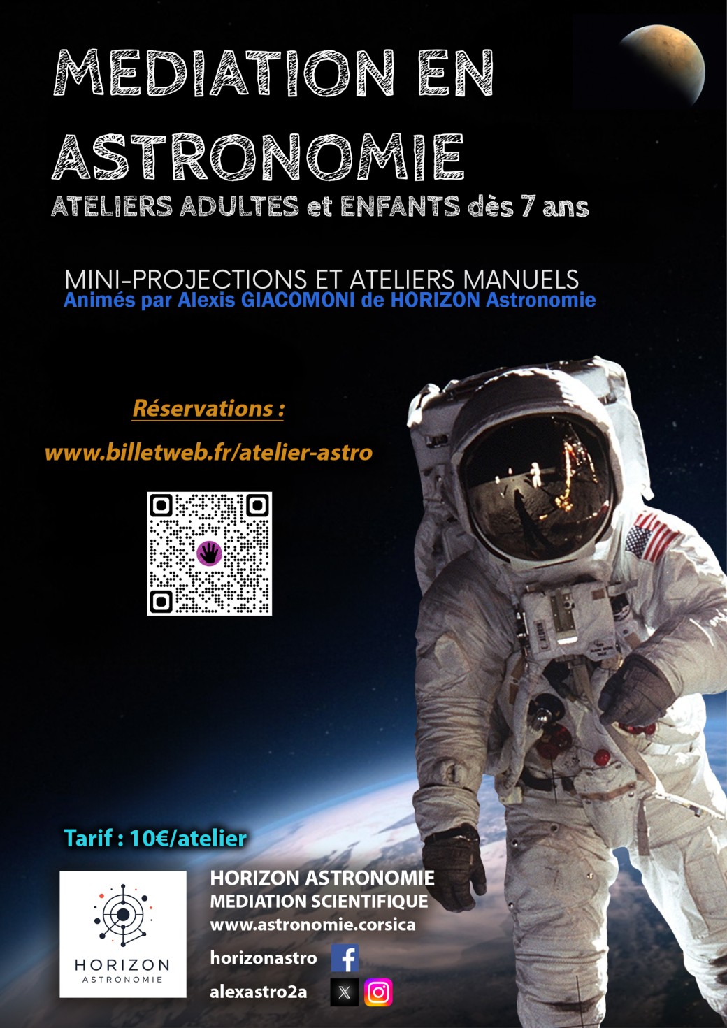 2026-05-20 14:00:00 2026-05-20 15:30:00 Europe/Paris Atelier d'astronomie - Adultes et enfants Reservations on : http://www.astronomie.corsica -- Ateliers manuels tout public (conseillé dès 7 ans). Chaque participant repart avec sa création ! Le 16 avril 2026 à "A casa di l'assocci" de TIUCCIA : - 16h : Système Soleil/Terre Lune. Le 02 mai 2026 à "A casa di l'assocci" de TIUCCIA : - 14h30 : Les constellations du zodiaque.   Le 16 mai 2026 à "A casa di l'assocci" de TIUCCIA : - 14h30 : La lumière et le Spectroscope. Le 23 mai 2026 à "A casa di l'assocci" de TIUCCIA : - 14h30 : Entraînement des astronautes et la Navette spatiale. - Le 20 mai 2026 à "A casa di e scenze". - 14h : atelier "Entraînement des astronautes et la Navette spatiale" - 16h : atelier "Système Soleil/Terre/Lune"   -------------------------------------------------------- La Casa di l'assocci de Tiuccia est située sous la médiathèque de la mairie annexe à Tiuccia.   A CASA DI E SCENZE est située : Rue Pierre et Marie Curie Lupino, 20600 Bastia Tiuccia et Casa di e Scenze, Lupino, Bastia, France Alexis Giacomoni EI