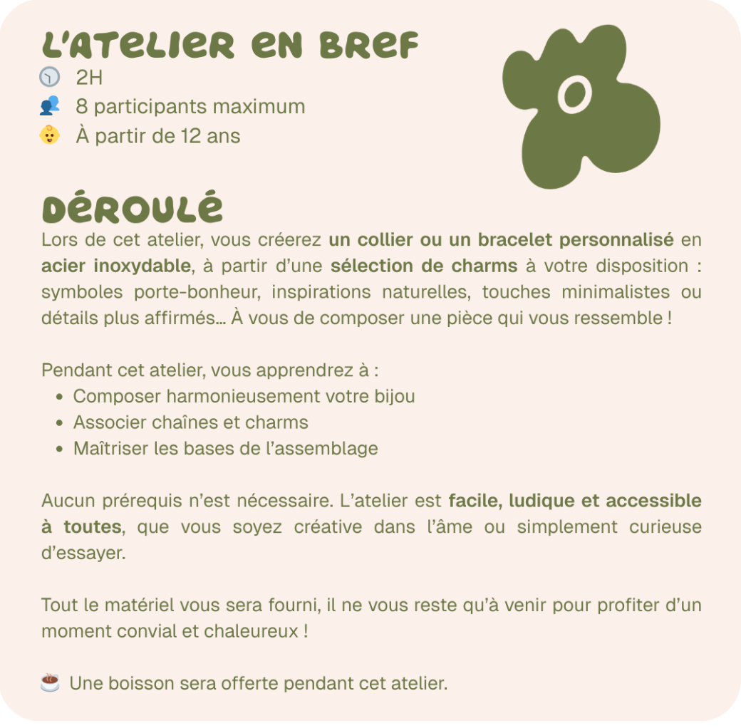 Offrez-vous une parenthèse créative et conviviale autour d’un café, et repartez avec un bijou unique, imaginé et réalisé par vos soins. Un moment cosy et créatif au Tadam Café !