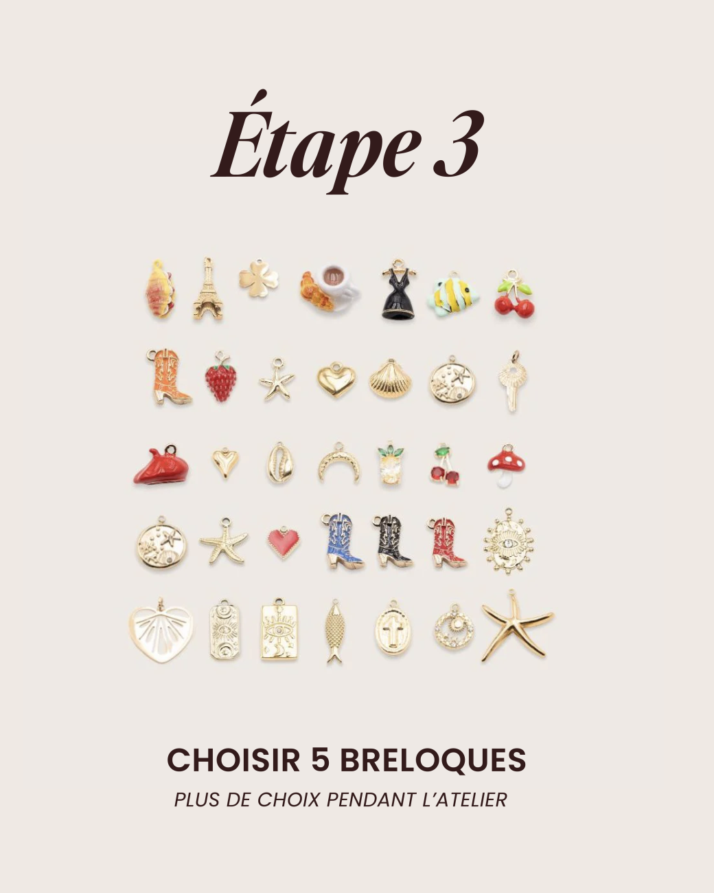 Composer ton collier de 5 à 7 charms dorées parmi un large choix (formes variées : cœurs, symboles, etc.)