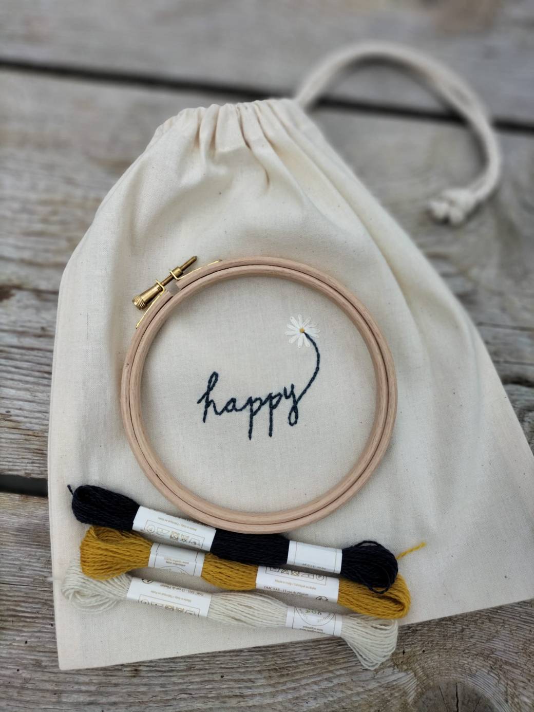 Tout le matériel est fourni : pochon en coton, fils colorés, aiguille, petit cercle à broder et accessoires nécessaires.