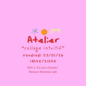 ouvert à la créativité "en terre d'étoiles" au cœur d'un espace sécurisé et créatif. Je vous accompagnerai le temps de 2H00 pour aller explorer ce qui devra emmerger dans l'instant présent via collage, découpe, couleurs, matières guidé par nos émotions et nos besoins intérieurs.