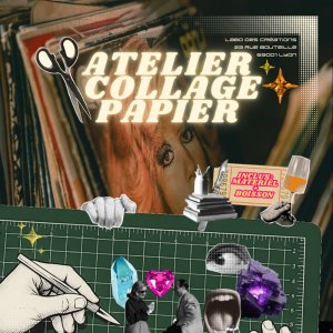Je propose des ateliers de collage papier (collage analogique) en favorisant la réutilisation de livres et magazines de seconde main, vintage et contemporains. Conçus comme des espaces d'exploration libre, et au-delà de l'esthétisme, l'action de feuilleter, de choisir, de découper, de déplacer, d'assembler puis de coller engagent l'attention et la concentration par la précision requise. La technique nécessite des micro-mouvements précis qui peuvent favoriser une forme de régulation et déclencher facilement les mécanismes du processus créatif.