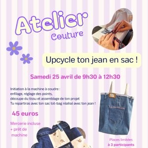 2026-04-25 09:30:00 2026-04-25 12:30:00 Europe/Paris Atelier couture – Upcycle ton jean en sac ! Reservations on : https://www.billetweb.fr/atelier-couture-upcycle-ton-jean-en-sac -- Et si ton vieux jean devenait ton nouveau sac préféré ? ♻️   Pendant cet atelier, je t’accompagne pas à pas pour découvrir la couture et donner une seconde vie à ton jean.   ???? Tu apprendras à : • prendre en main une machine à coudre (même si tu débutes complètement) • enfiler, régler et faire tes premiers points • découper ton tissu et assembler ton projet ✨ Et surtout… tu repartiras avec ton tote bag unique, créé de tes propres mains à partir de ton jean.   Un moment créatif, accessible et ultra satisfaisant… où ton jean ne finira (enfin) pas au fond d’un tiroir ????   Accessible à partir de 12 ans.   Prévois un jean, taille adulte. Pas trop d'elasthanne dans sa composition, si possible, pour une belle tenue à ton sac. Si tu as besoin que je fournisse un jean, envoie-moi un mail à Coco.atelier.handmade@gmail.com.    Tu peux aussi apporter ta machine à coudre, si tu le souhaites.   Le tarif comprend également : le tissu de doublure et la mercerie. Lieu : Épicerie La Petite Vrac. 4… La Petite Vrac, 42 rue de la Jouardais, 44640 Le Pellerin, France Corinne Vigneron EI