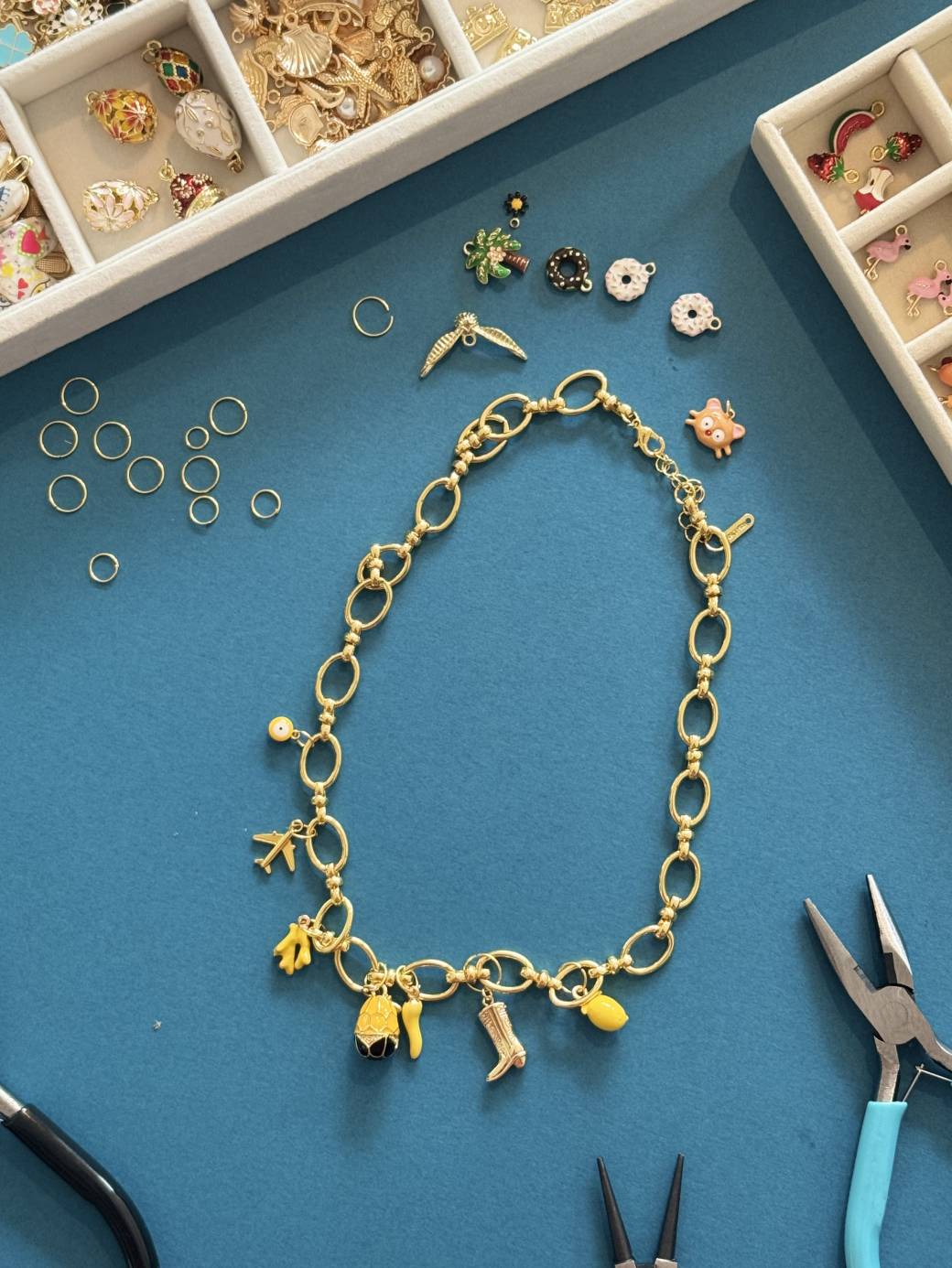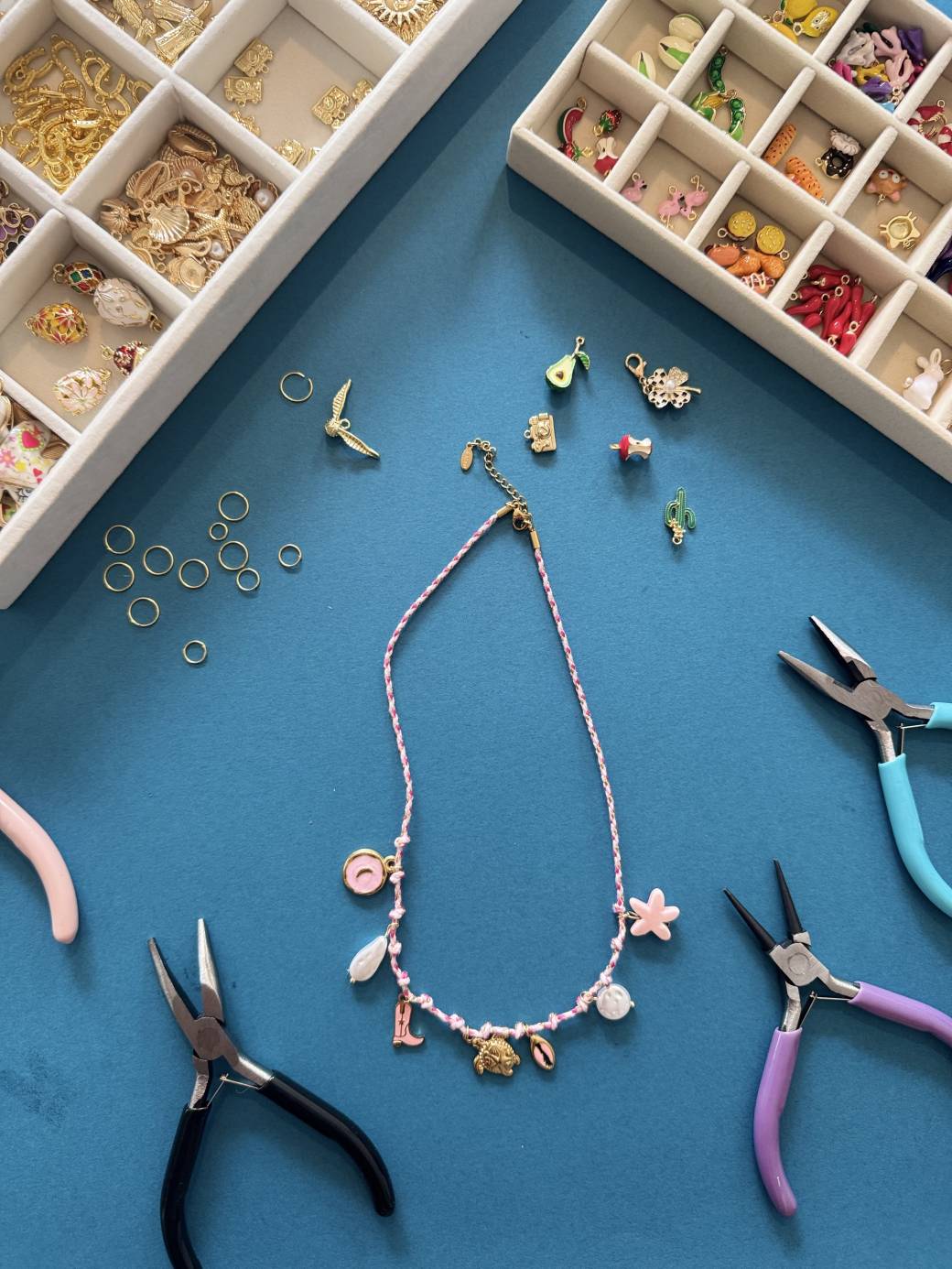 Tout le matériel fourni (breloques, perles, attaches, chaînes, outils…)
