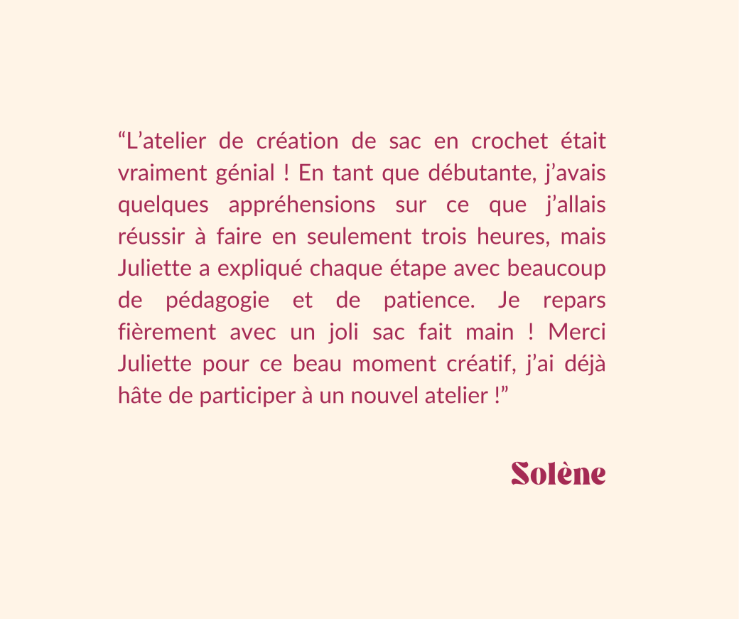 ✨ Au programme de ces ateliers créatifs : tu vas apprendre à créer ton propre sac à main ou ton chouchou en crochet, à partir d’une maille de base accessible même si tu débutes ! Pas à pas, tu verras ton sac ou ton chouchou prendre forme entre tes mains !