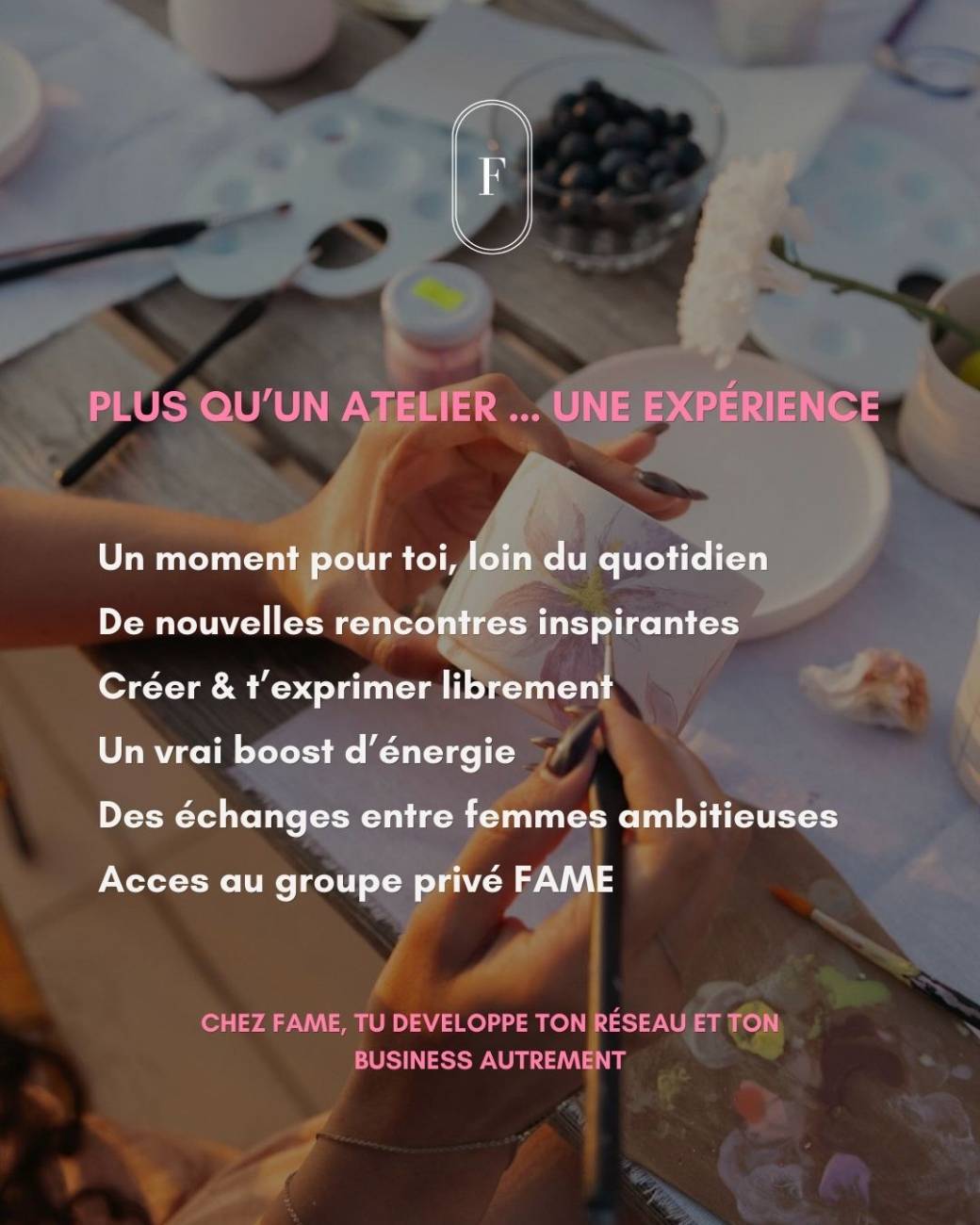 Un moment pour ralentir, créer et rencontrer des femmes inspirantes et rejoindre notre communauté FAME et notre groupe privé whatsapp.