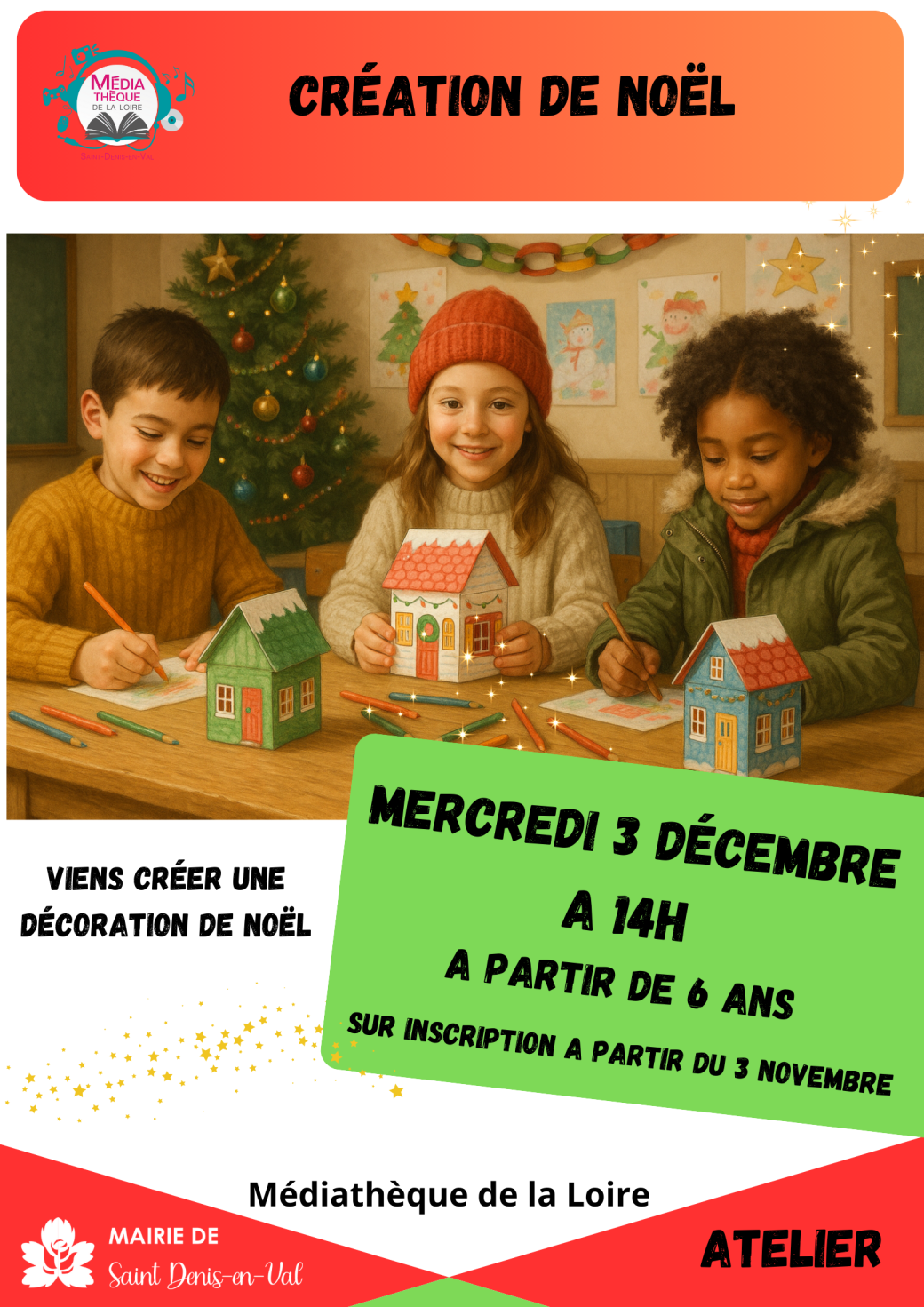2025-12-03 14:00:002025-12-03 15:00:00Europe/ParisAtelier création de NoëlReservations on : https://www.mediathequesaintdenisenval.net/
