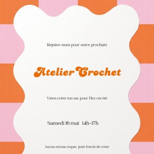Rejoins-nous pour la toute première édition atelier crochet pour créer ton sac. L'atelier se déroule le 16 mai de 14h à 17h.