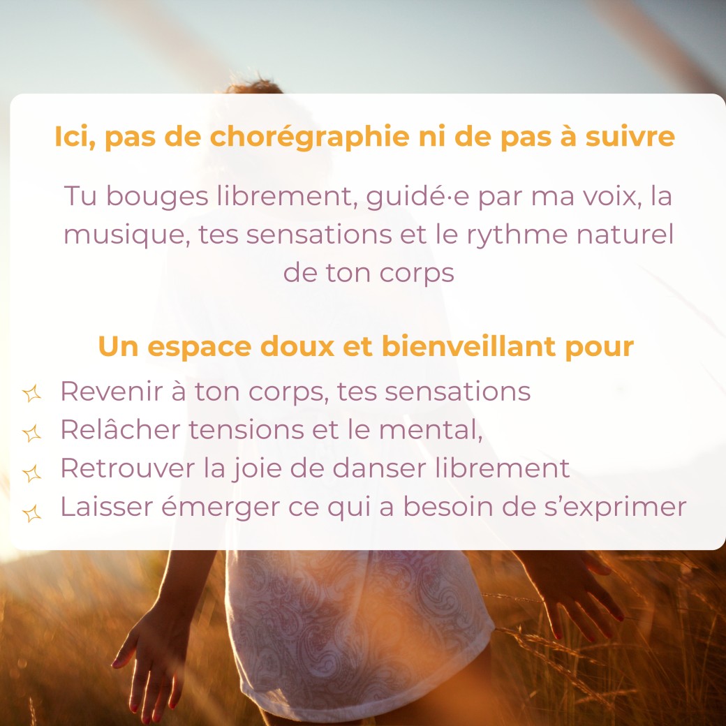 Ici, aucune chorégraphie, aucun pas à apprendre : chacun bouge librement, guidé·e par ma voix, la musique, ses sensations et le rythme naturel de son corps.