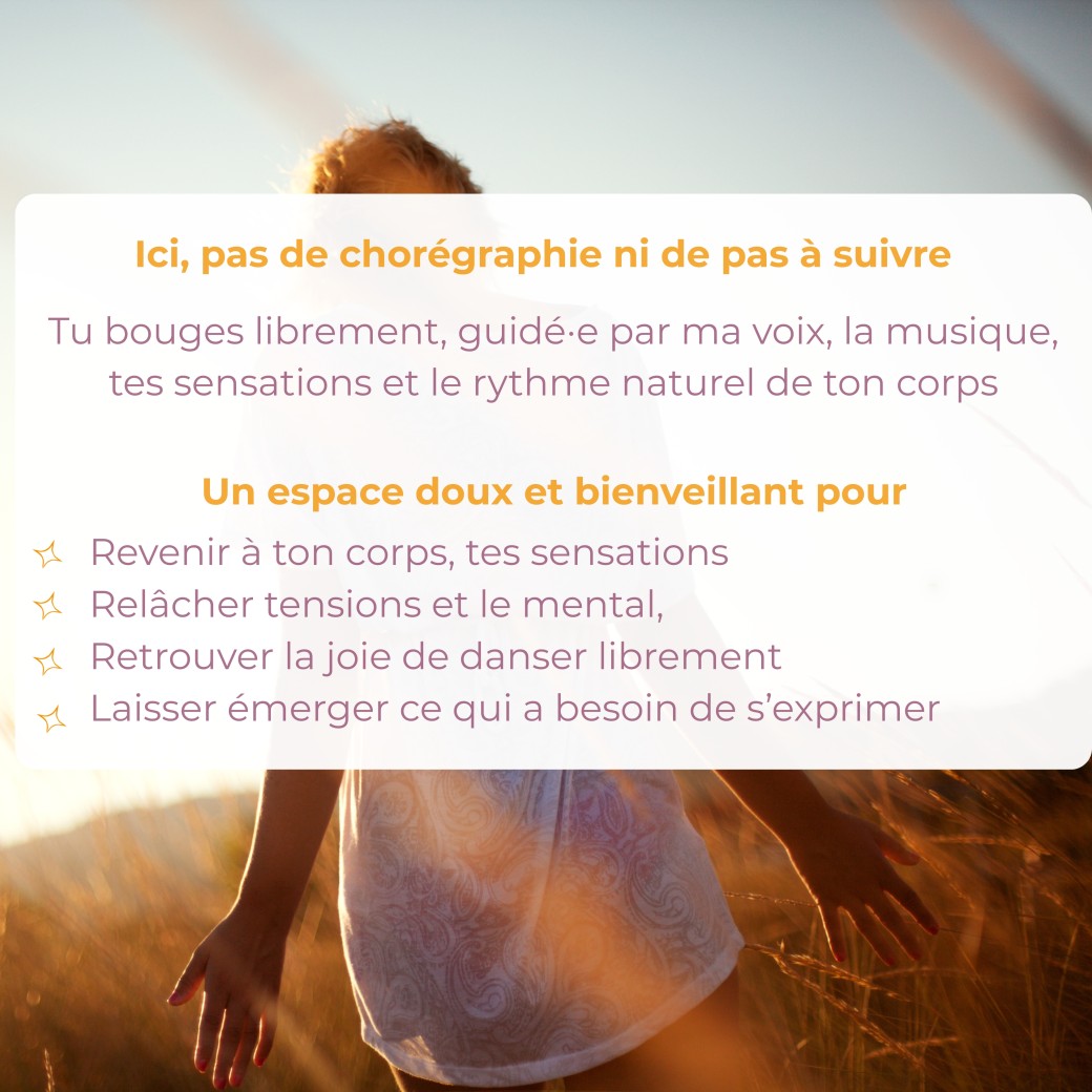 Ici, aucune chorégraphie, aucun pas à apprendre : chacun bouge librement, guidé·e par ma voix, la musique, ses sensations et le rythme naturel de son corps.