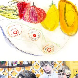 Un atelier complice parent-enfant pour créer une œuvre à quatre mains sur le thème du repas : Qui mange ? qu'est-ce qu'on mange ? Comment on dessine ce qu'il y a sur la table ? Mmm... ça donne faim !