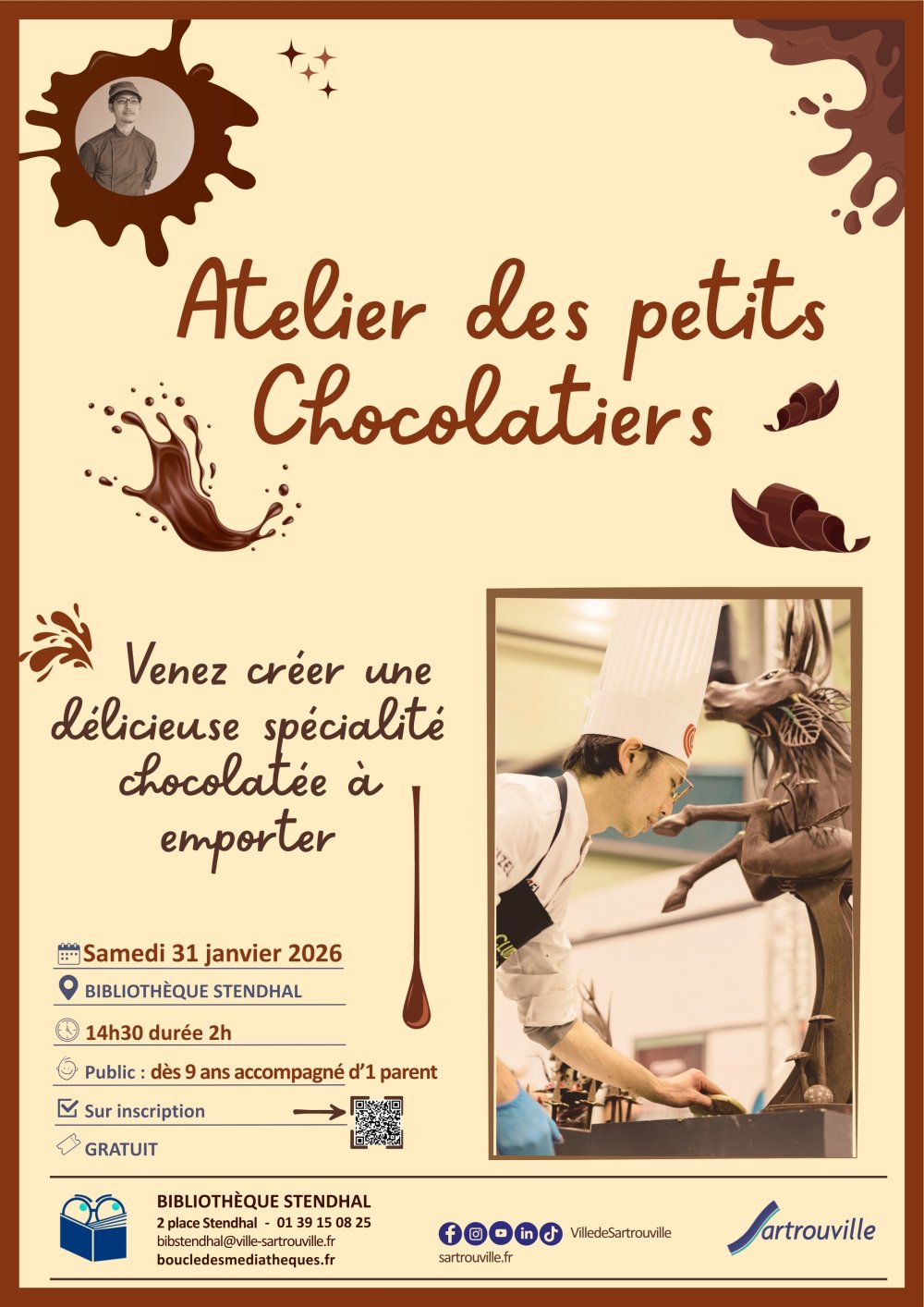 2026-01-31 14:30:00 2026-01-31 16:30:00 Europe/Paris Atelier des petits chocolatiers à la bibliothèque Stendhal Reservations on : https://www.boucledesmediatheques.fr/Sartrouville -- Voyage gourmand en famille     Plongez dans l'univers fascinant du chocolat ! Petits et grands voyageront dans le temps pour retracer l’histoire du cacao, perceront les mystères de sa fabrication, puis passeront à l’action pour créer ensemble une délicieuse spécialité chocolatée à emporter. Cet atelier est conçu et encadré par Ryo. Enfant dès 9 ans + 1 parent obligatoire   Gratuit sur inscription   Bibliothèque Stendhal, Rue Saint-Exupéry, Sartrouville, France Bibliothèque Stendhal