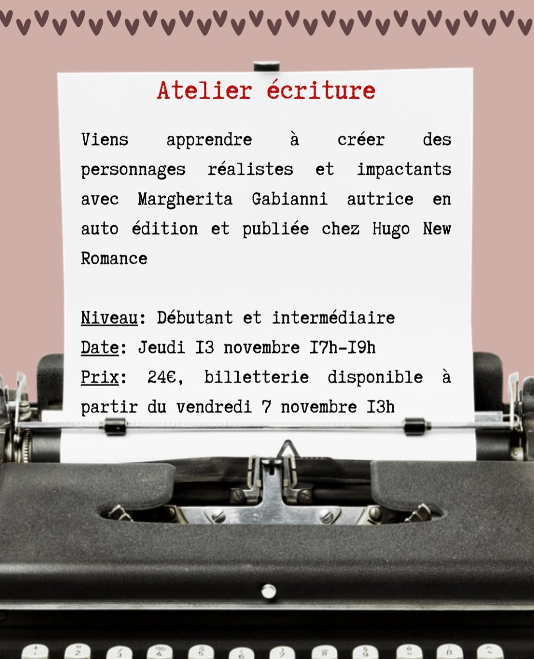 2025-11-13 18:00:002025-11-13 20:00:00Europe/ParisAtelier écriture - Créer des personnages réalistes et impactants Reservations on : https://www.billetweb.fr/atelier-ecriture-creer-des-personnages-realistes-et-impactants