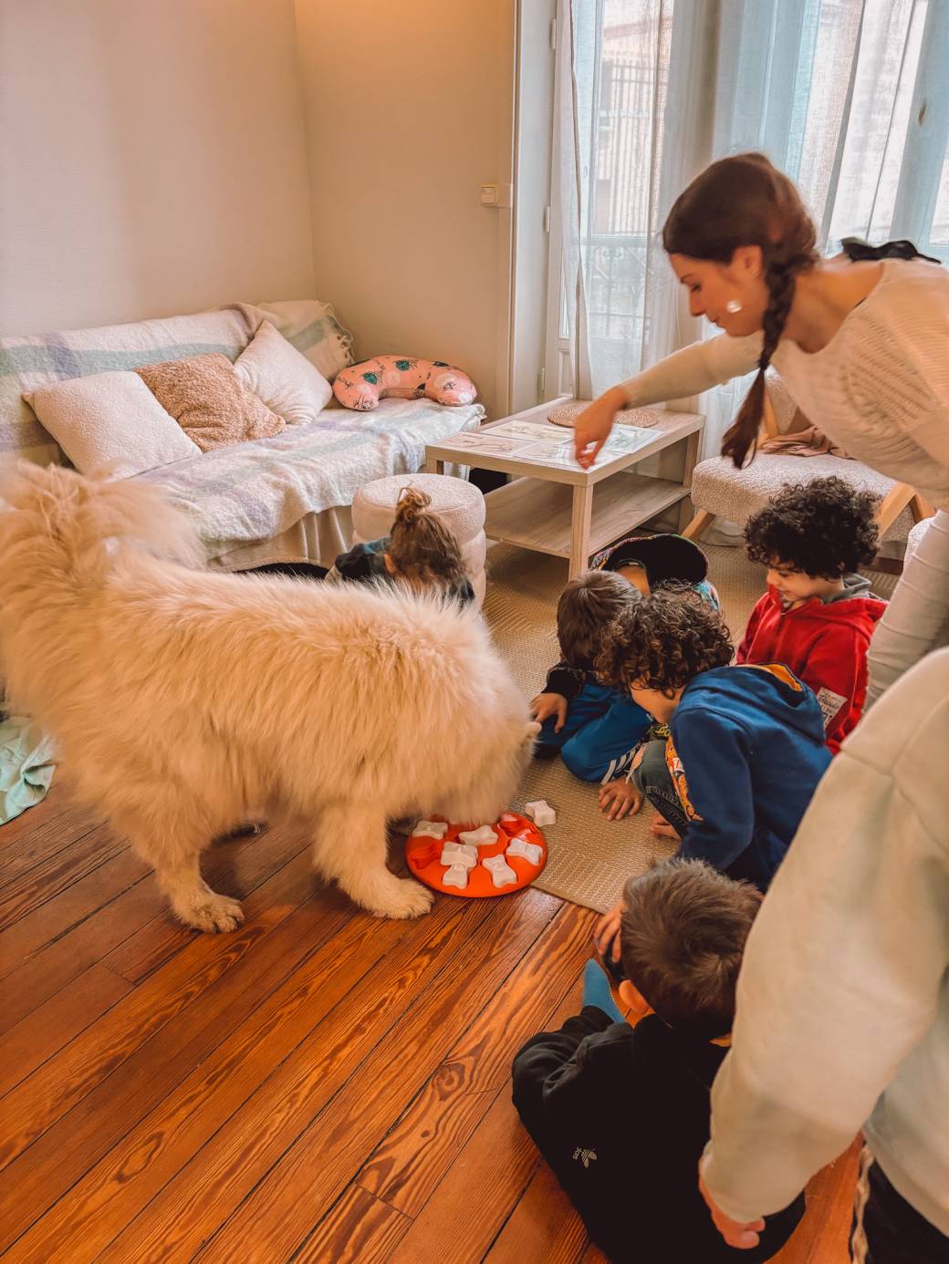 Un doux moment entre les enfants et les animaux encadré par Elodie (intervenante en mediation animale et fondatrice de Passion CanyCat)