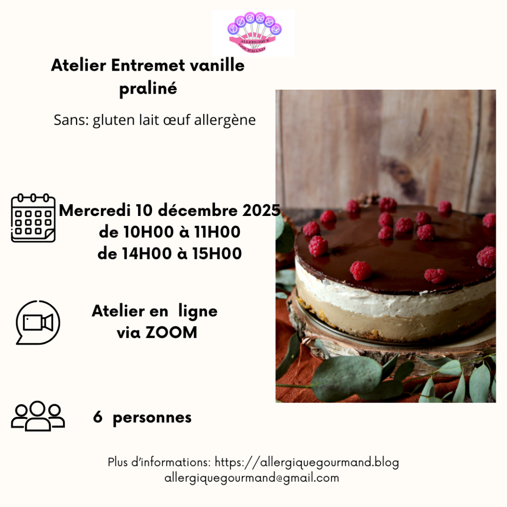 Entremet vanille praliné sans gluten lait oeufs soja arachide FAC etc.