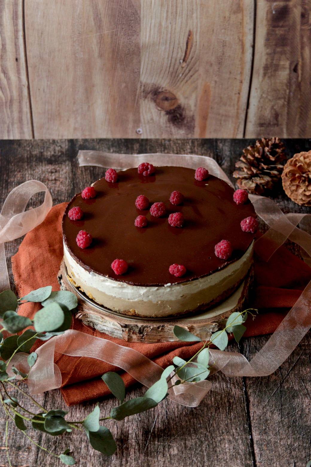 Une base croustillante, une crème pralinée sans aucun fruits à coques, une mousse vanillée, des saveurs que le glaçage chocolat vient réhausser.