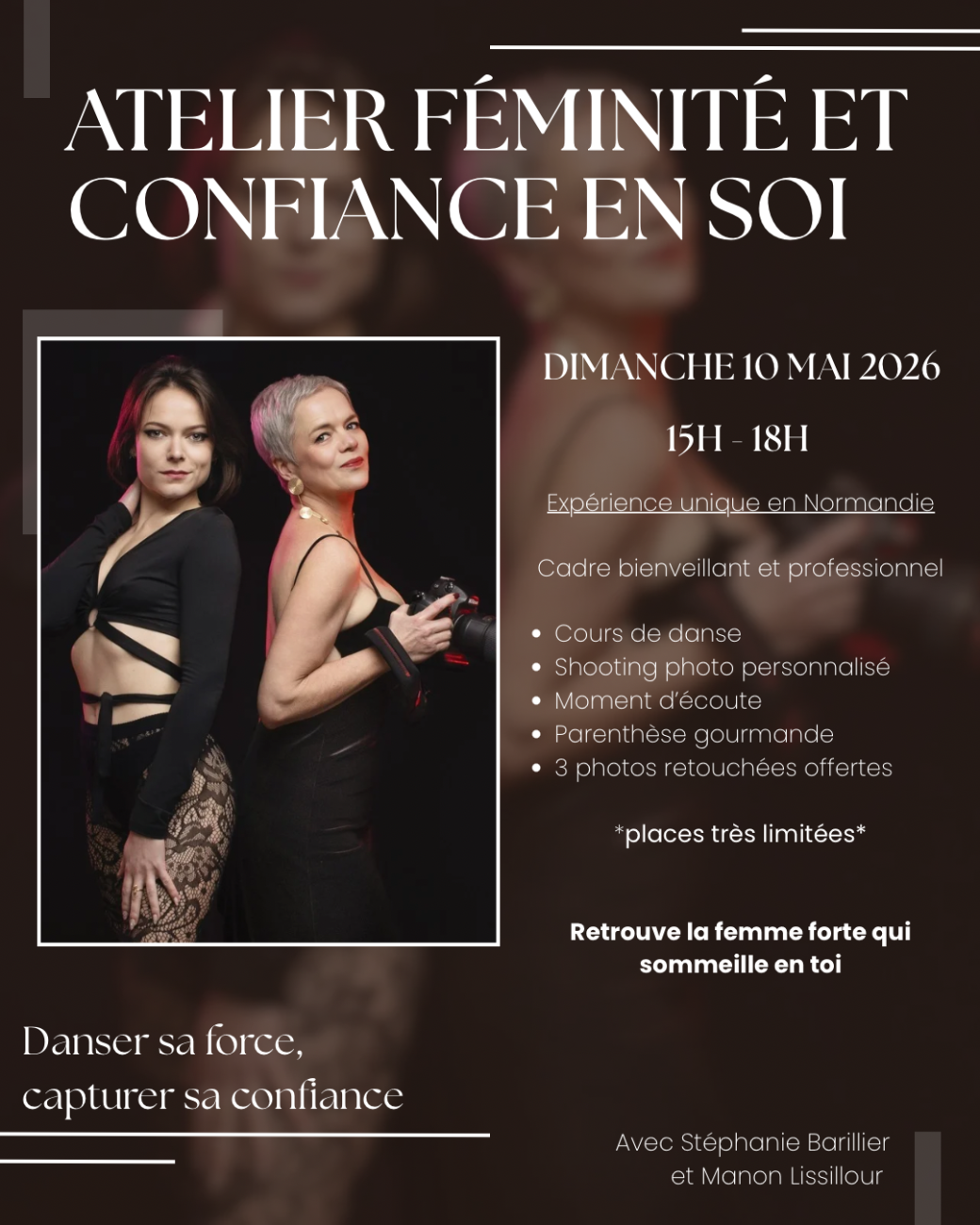 3 photos souvenirs par participantes, retouchées et envoyées par mail après l'atelier.